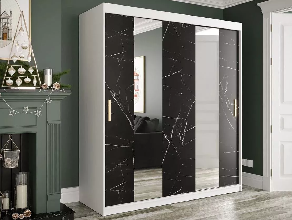 Šatní skříň 180 cm se zrcadlem CARSON 4 - černý mramor / bílá / zlatá