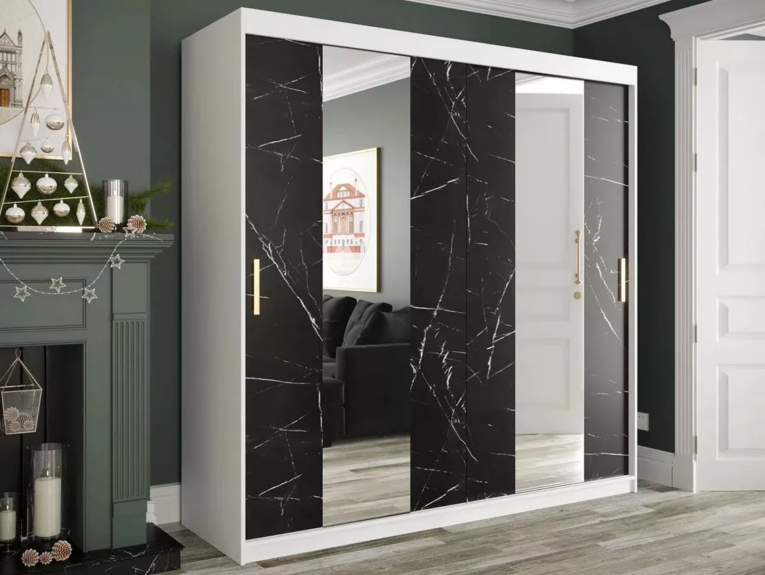 Šatní skříň 200 cm se zrcadlem CARSON 4 - černý mramor / bílá / zlatá