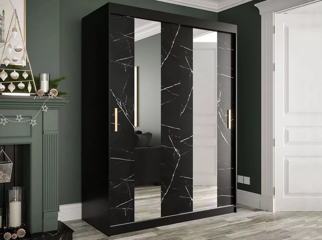 Šatní skříň 150 cm se zrcadlem a šuplíky CARSON 1 - černý mramor / černá / zlatá