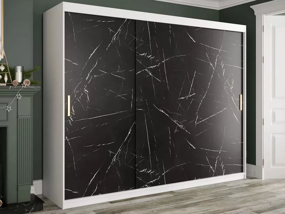 Moderní velká šatní skříň 250 cm se šuplíky CARSON 2 - černý mramor / bílá / zlatá