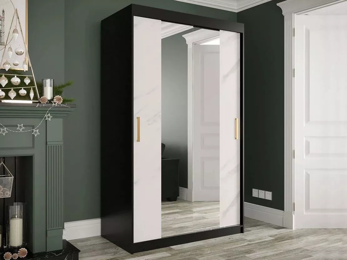 Úzká šatní skříň 120 cm se zrcadlem a šuplíky CARSON 3 - bílý mramor / černá / zlatá