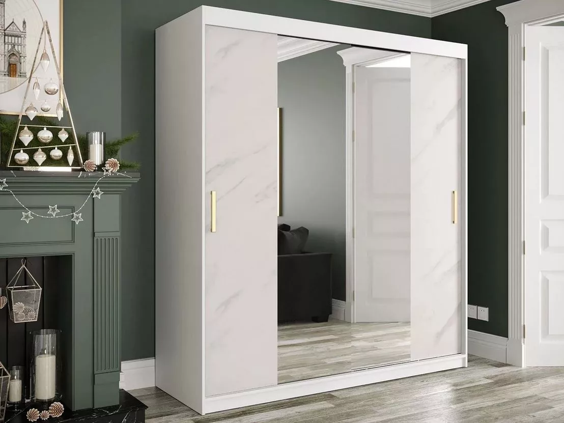 Šatní skříň se zrcadlem CARSON spojuje praktičnost s moderním designem. Zrcadlové dveře opticky zvětšují prostor. Hluboké poličky, šuplíky a 2 šatní tyče umožňují snadné uspořádání šatníku a poskytují dostatek místa pro všechny vaše věci. Jedinečný design skříně podtrhují mramorový efekt a zlaté úchyty.