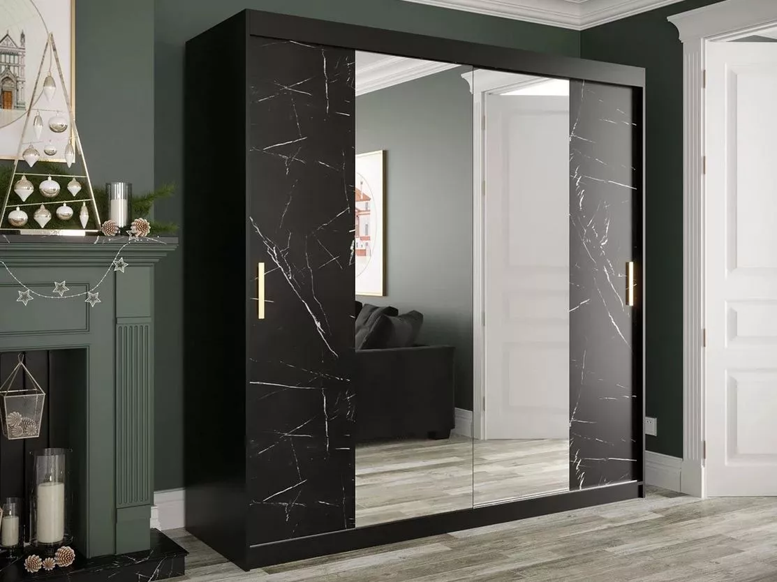 Šatní skříň 200 cm se zrcadlem a šuplíky CARSON 3 - černý mramor / černá / zlatá