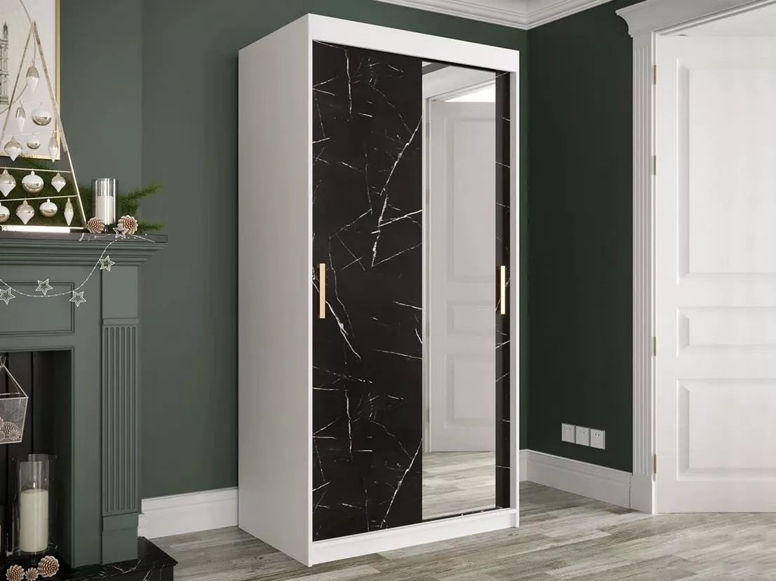 Úzká šatní skříň 100 cm se zrcadlem a šuplíky CARSON 4 - černý mramor / bílá / zlatá