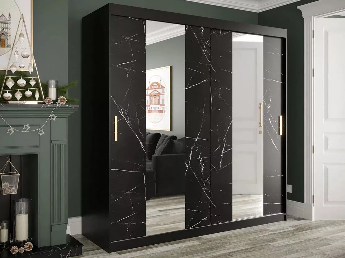 Šatní skříň 200 cm se zrcadlem a šuplíky CARSON 4 - černý mramor / černá / zlatá