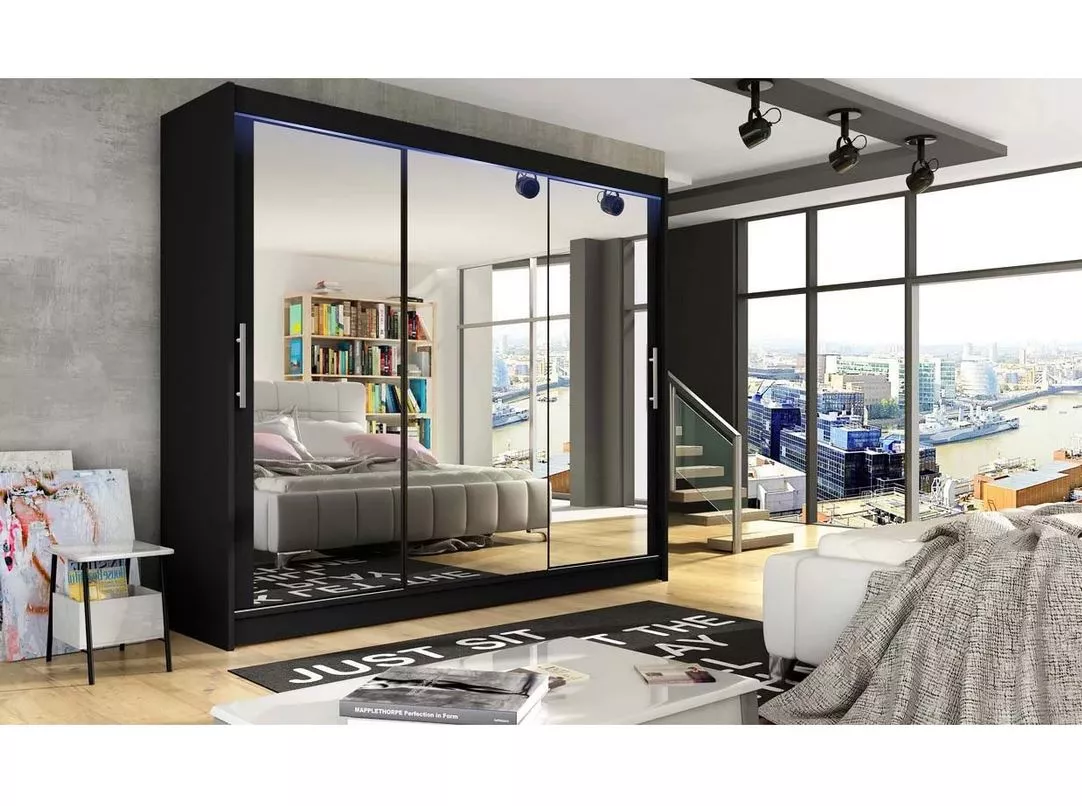 Vysoká šatní skříň se zrcadlem 250 cm HORTENSIA 3 - černá + RGB osvětlení ZDARMA