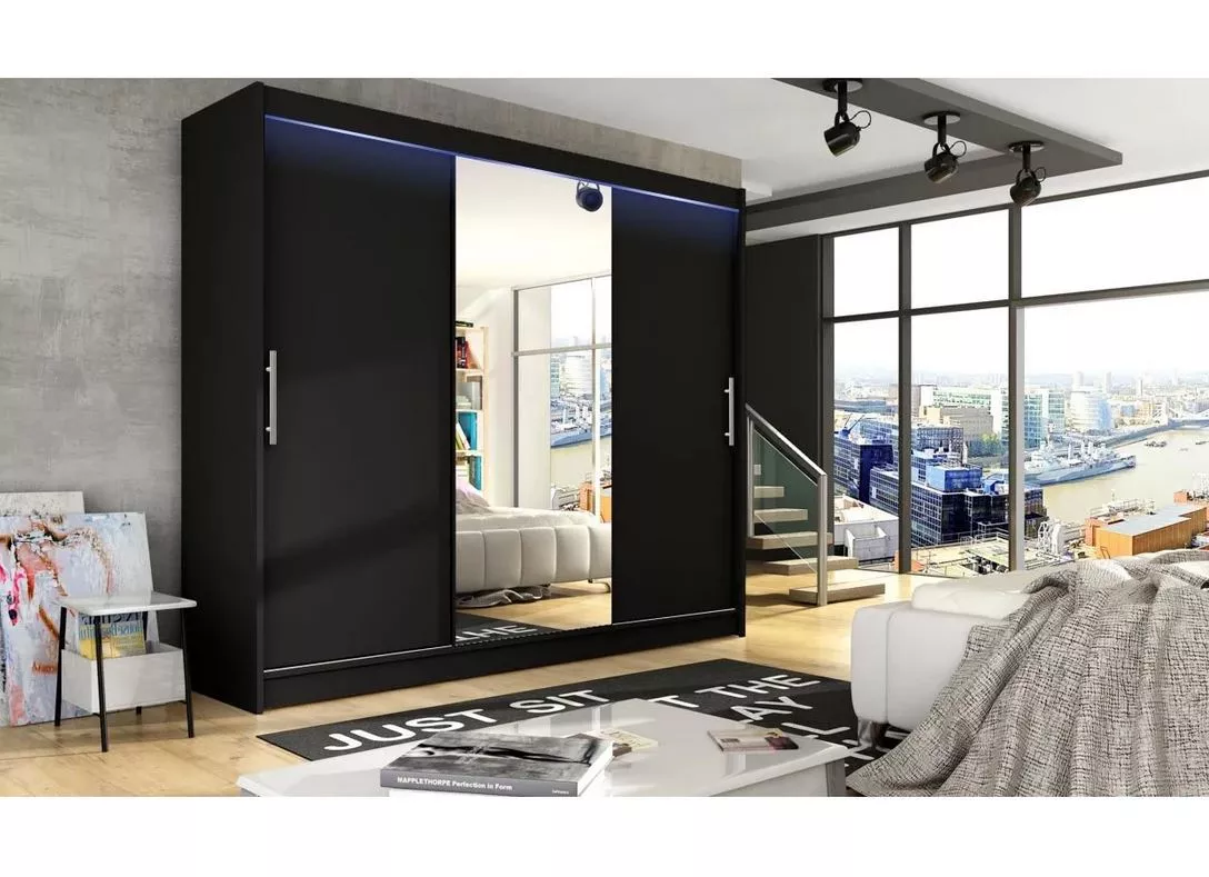 Velká šatní skříň se zrcadlem 250 cm HORTENSIA 1 - černá + RGB osvětlení ZDARMA
