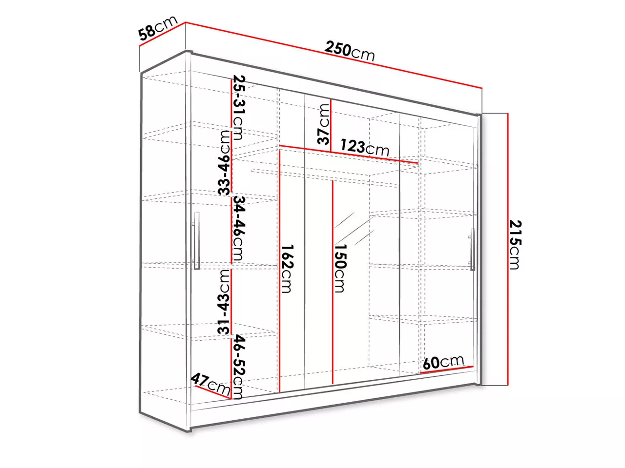 HORTENSIA 1 s LED osvětlením je mimořádně prostorná šatní skříň s posuvnými dveřmi v moderním stylu. Nepochybnou výhodou je velké zrcadlo, které opticky zvětšuje prostor a vnáší do místnosti více světla. Interiér šatní skříně vás okouzlí svým přívětivým a funkčním uspořádáním.