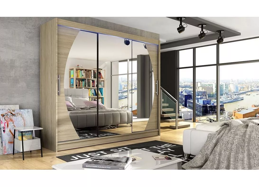 Velká zrcadlová šatní skříň 250 cm HORTENSIA 9 - dub sonoma + RGB osvětlení ZDARMA
