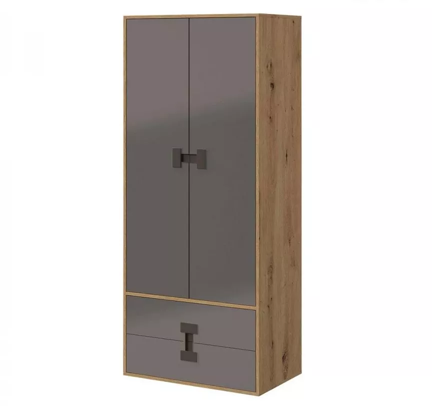 Dvoudveřová šatní skříň BASHIRA - 80 cm, dub / lesklá šedá
