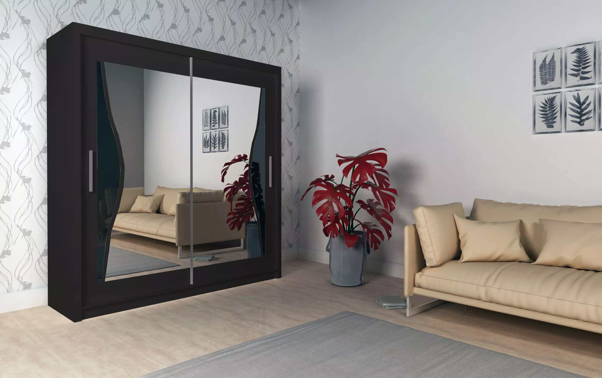 Šatní skříň SERVELA skvěle doplní váš interiér. Praktické posuvné dveře oceníte v boji s nedostatkem místa. Uvnitř skříně jsou police a šatní tyče.