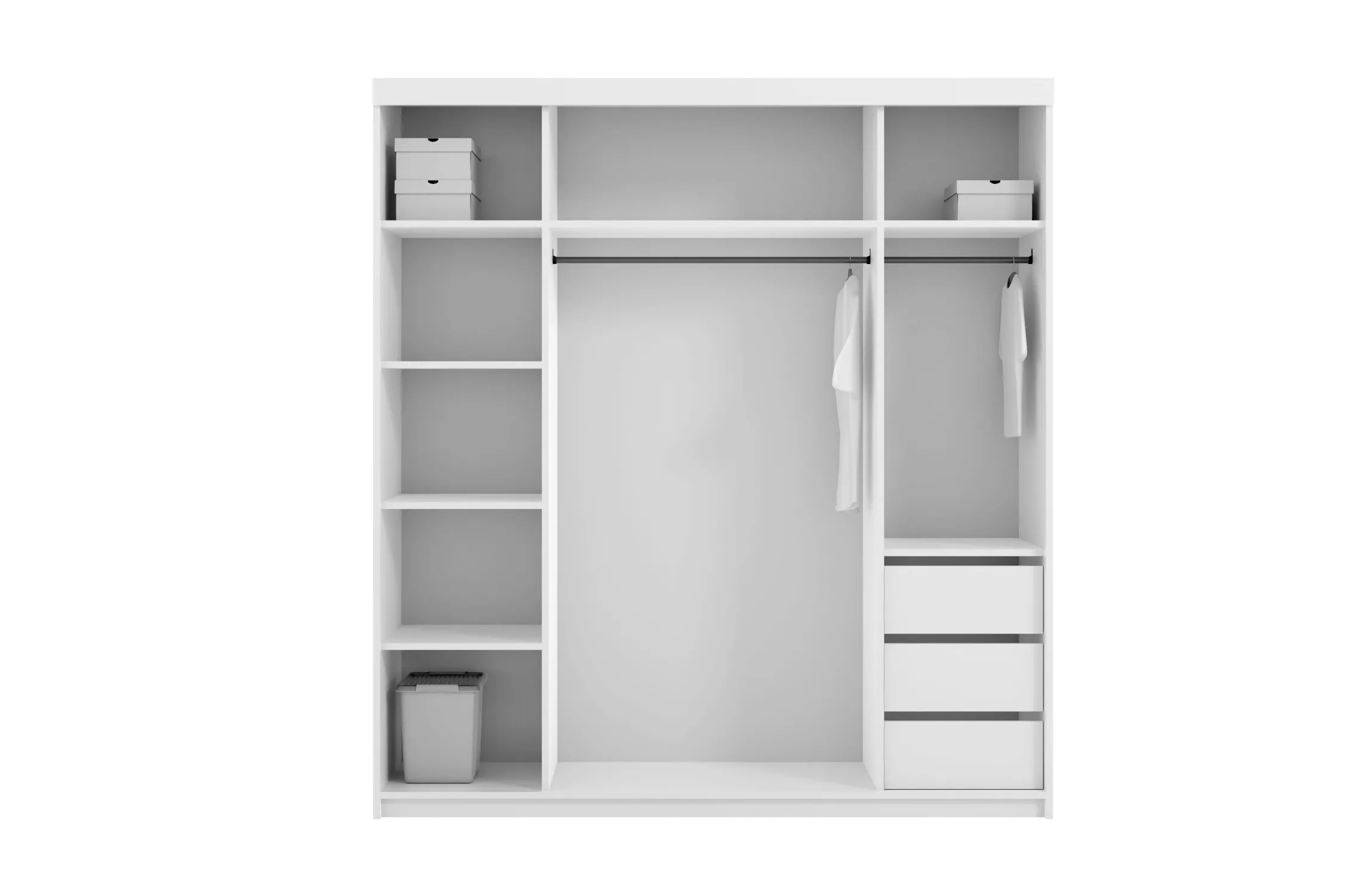 Moderní zrcadlová šatní skříň MOMO představuje spojení elegance a funkcionality. Nabízí dostatek úložného prostoru v podobě policového systému, šuplíků a 2 šatních tyčí.