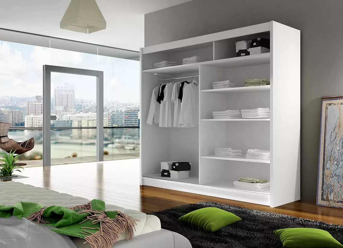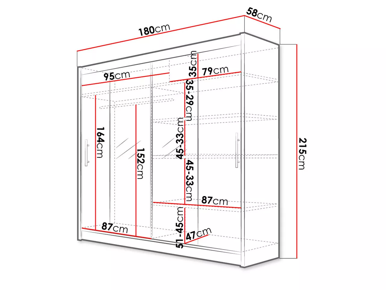 Vysoká šatní skříň FLORENCIO 2 se vyznačuje obrovskou kapacitou a funkčností a umožňuje pečlivě organizovat prostor v místnosti. Uvnitř skříně naleznete šatní tyč na zavěšení oblečení a prostorné police. Zrcadlo umístěné na středovém čele opticky zvětšuje prostor a pozitivně ovlivňuje komfort užívání.