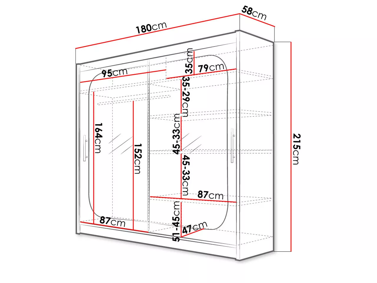 Šatní skříň se zrcadlem FLORENCIO kombinuje praktické vlastnosti a moderní design, což z ní činí skvělé řešení pro každou ložnici. Zrcadlové dveře opticky zvětšují místnost a dodávají prostoru svěží vzhled. Díky vnitřnímu uspořádání budete mít dostatek místa pro všechny své věci a snadno si uspořádáte šatník.