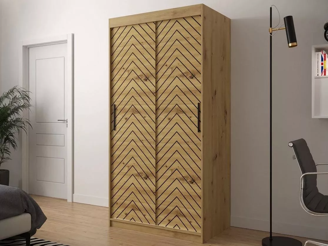 Dodejte své ložnici styl s moderní šatní skříní ORIOT, jejíž posuvné dveře zdobí elegantní geometrický vzor. Uvnitř najdete praktické police i 2 šatní tyče pro dokonalou organizaci oblečení. Vysoká konstrukce vám poskytne dostatek místa, aniž by zabírala více prostoru v místnosti.