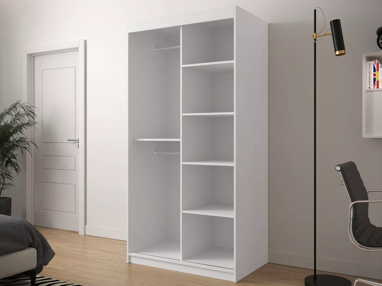 Dodejte své ložnici styl s moderní šatní skříní ORIOT, jejíž posuvné dveře zdobí elegantní geometrický vzor. Uvnitř najdete praktické police i 2 šatní tyče pro dokonalou organizaci oblečení. Vysoká konstrukce vám poskytne dostatek místa, aniž by zabírala více prostoru v místnosti. Zrcadlo umístěné na dvířkách opticky zvětšuje prostor a vnáší do interiéru více světla.