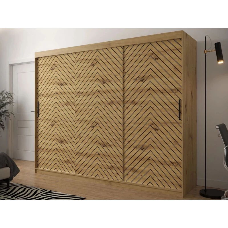 Dodejte své ložnici styl s moderní šatní skříní ORIOT, jejíž posuvné dveře zdobí elegantní geometrický vzor. Uvnitř najdete praktické police i 2 šatní tyče pro dokonalou organizaci oblečení. Vysoká konstrukce vám poskytne dostatek místa, aniž by zabírala více prostoru v místnosti.
