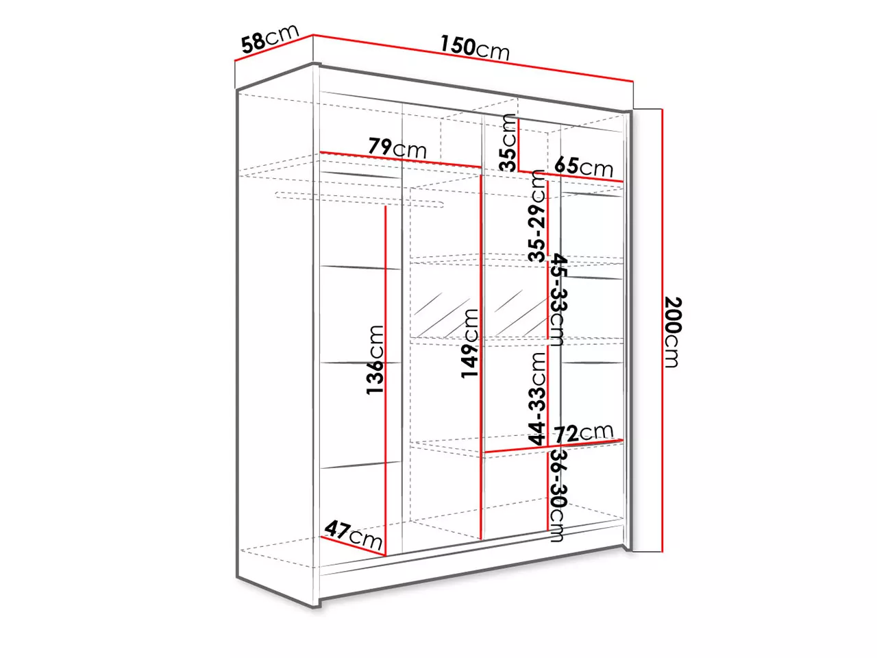 Šatní skříň s posuvnými dveřmi PIRITU je ideálním řešením pro efektivní organizaci v ložnici nebo předsíni. Zrcadlová dvířka nejen skvěle doplňují design, ale díky odrážení světla také opticky zvětšují prostor. Skříň poskytuje dostatek úložného prostoru s hlubokými policemi a praktickou šatní tyčí pro zavěšení oblečení.