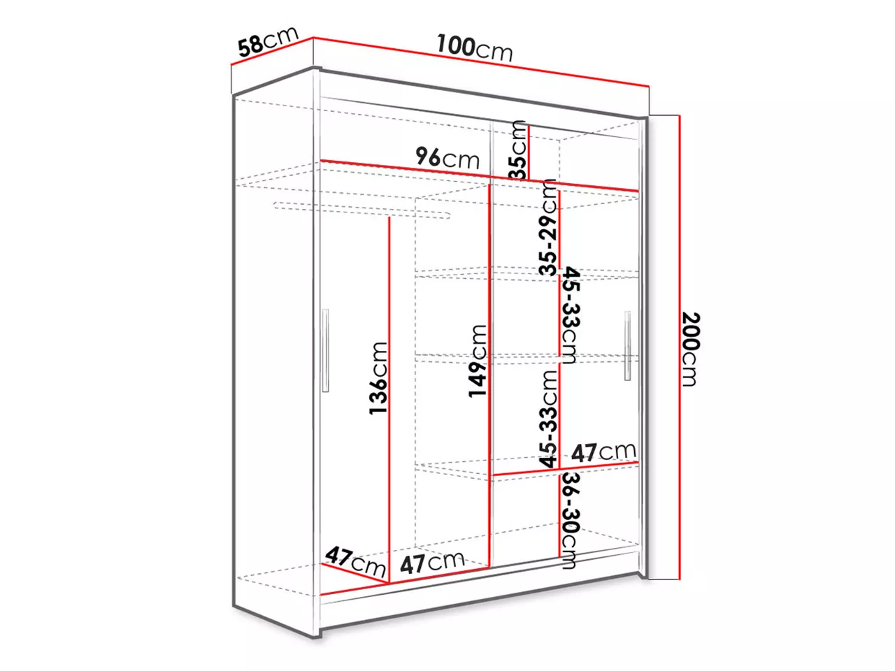 Dokonalé řešení pro úzké prostory – to je šatní skříň VILMEA. S šířkou 100 cm nezabere mnoho místa, ale díky výšce 200 cm poskytne dostatek úložného prostoru. Praktické vnitřní uspořádání vám pomůže udržet oblečení přehledně uspořádané.