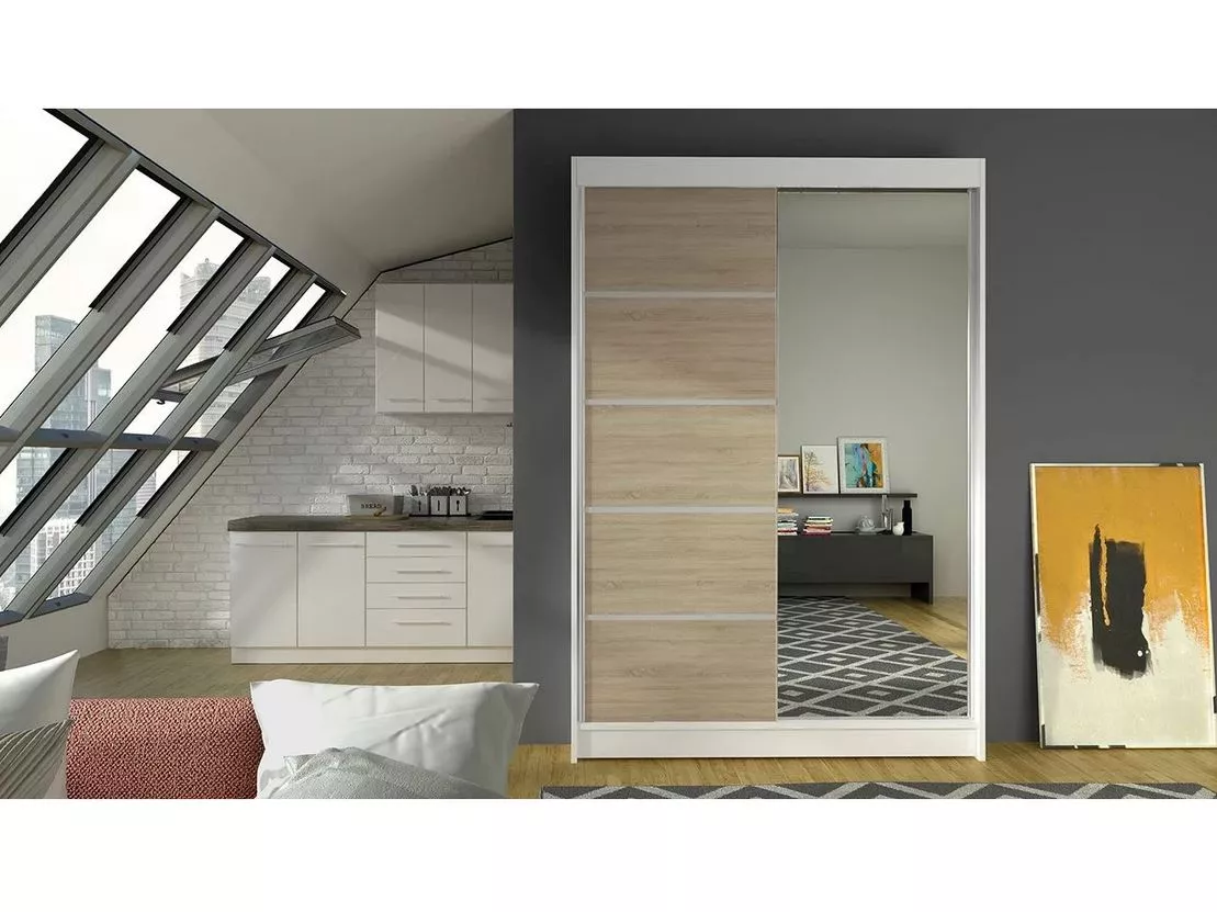 Vysoká šatní skříň 120 cm se zrcadlem SAMANRE 3 - dub sonoma / bílá