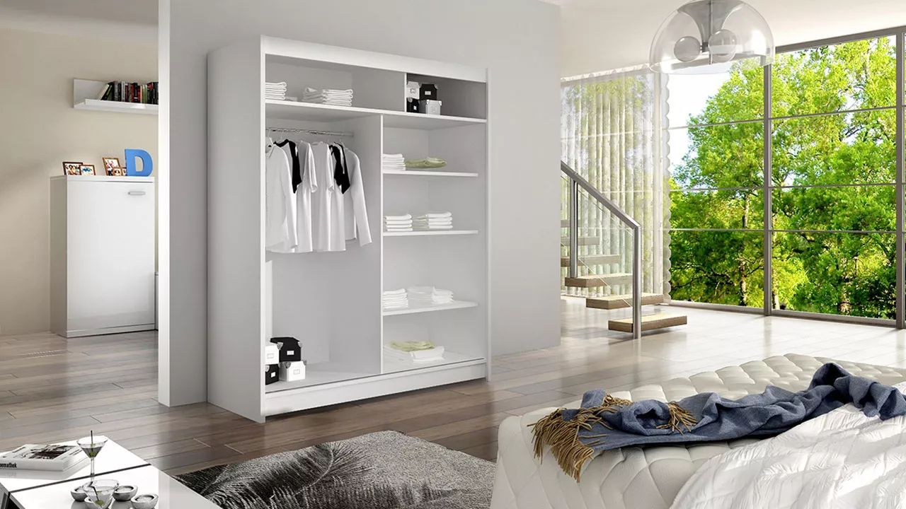 Získejte šatní skříň SAMANRE, která se stane nejen praktickým pomocníkem, ale i moderním kouskem vaší ložnice či předsíně. Posuvné dveře se zrcadlem přinášejí více světla a prostoru, zatímco vnitřní uspořádání s hlubokými policemi a šatní tyčí umožní dokonalou organizaci.
