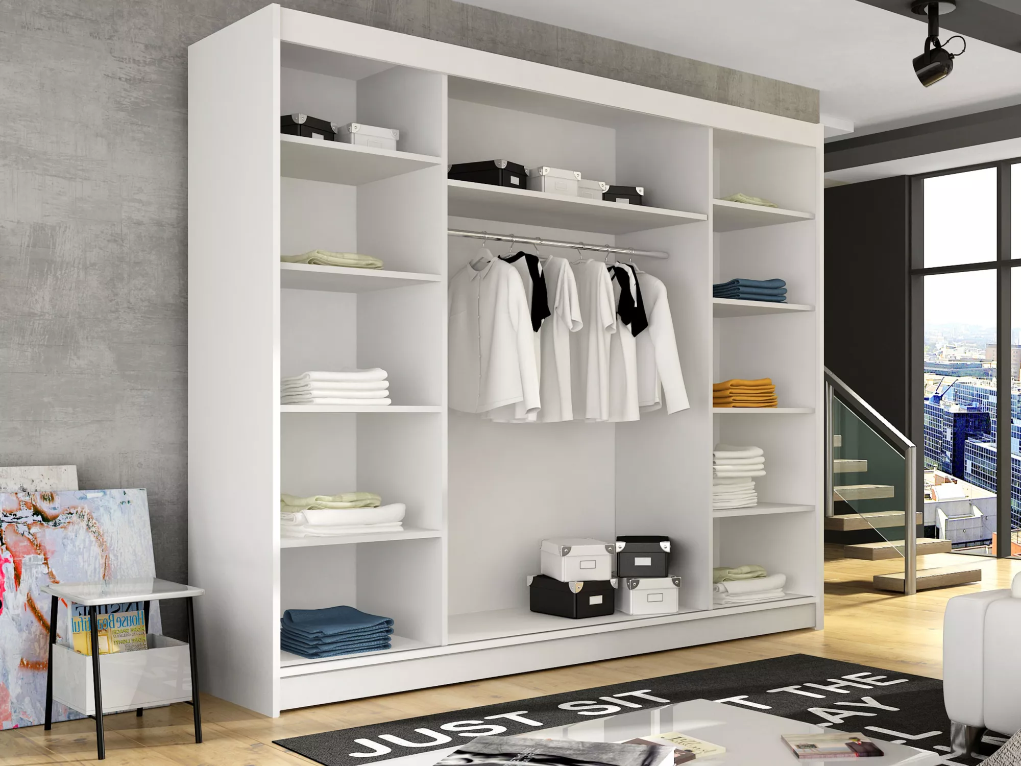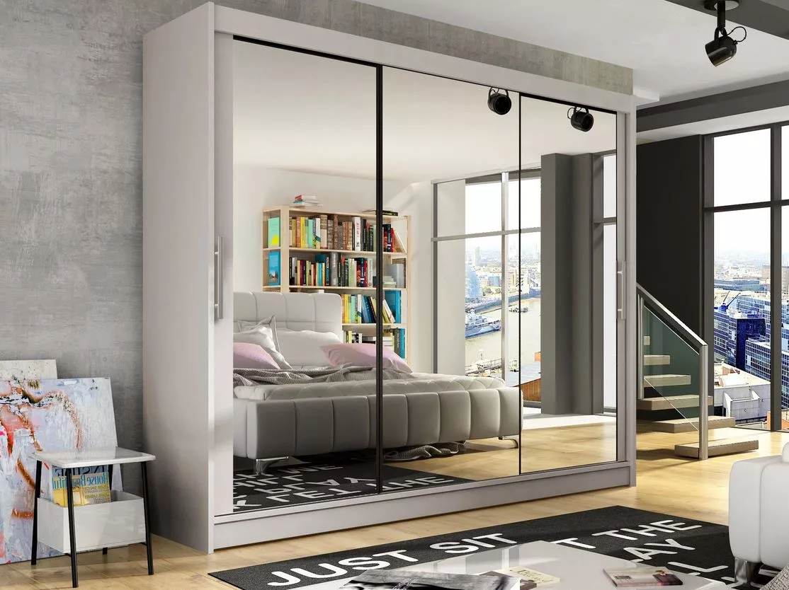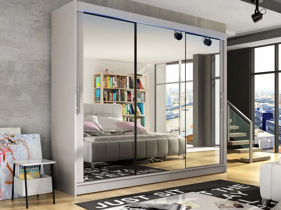 HORTENSIA 3 s LED osvětlením je mimořádně prostorná šatní skříň s posuvnými dveřmi v moderním stylu. Nepochybnou výhodou je velké zrcadlo, které opticky zvětšuje prostor a vnáší do místnosti více světla. Interiér šatní skříně vás okouzlí svým přívětivým a funkčním uspořádáním.