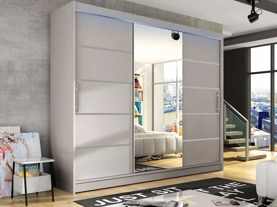HORTENSIA 4 s LED osvětlením je mimořádně prostorná šatní skříň s posuvnými dveřmi v moderním stylu. Nepochybnou výhodou je velké zrcadlo, které opticky zvětšuje prostor a vnáší do místnosti více světla. Interiér šatní skříně vás okouzlí svým přívětivým a funkčním uspořádáním.