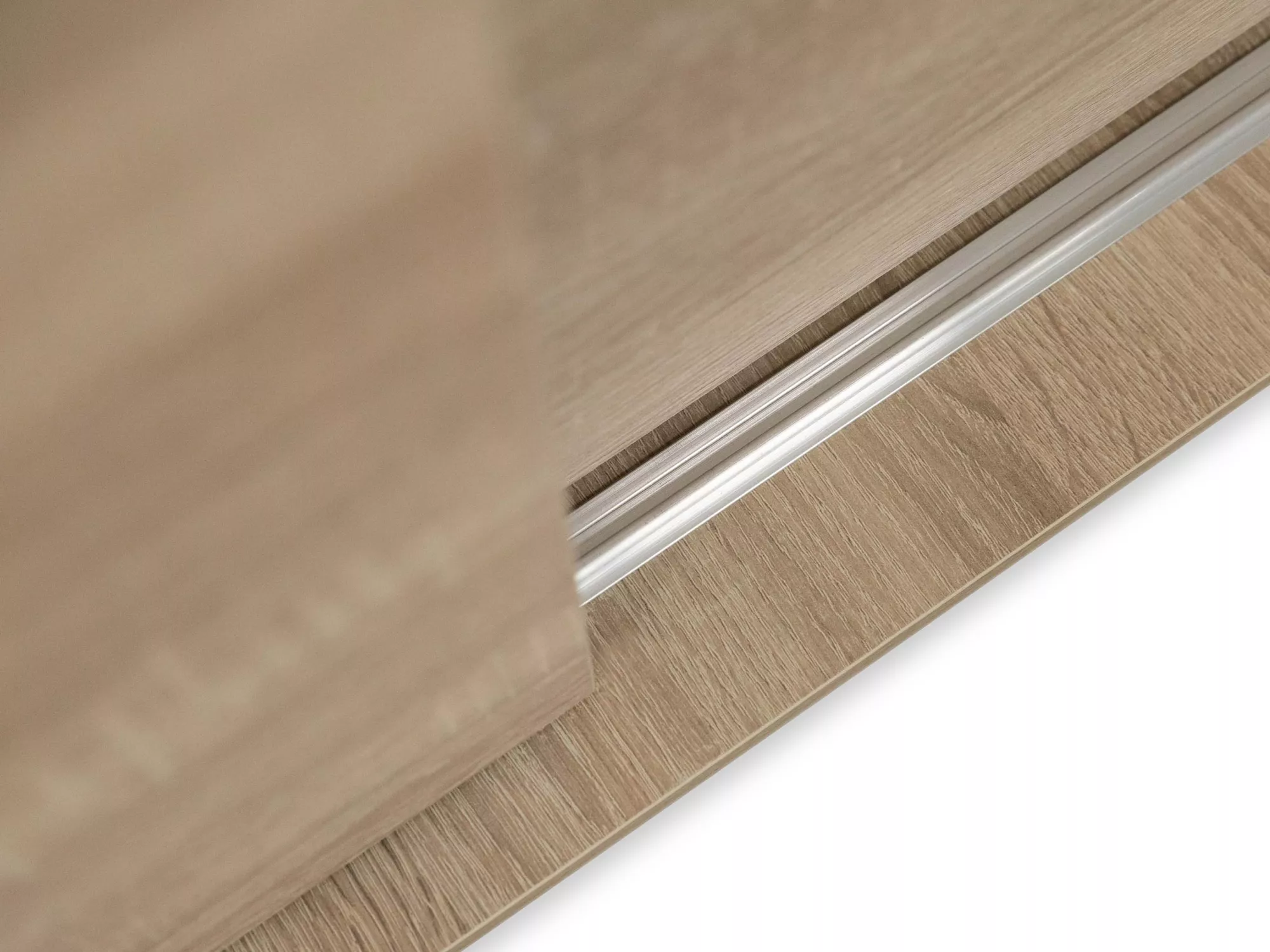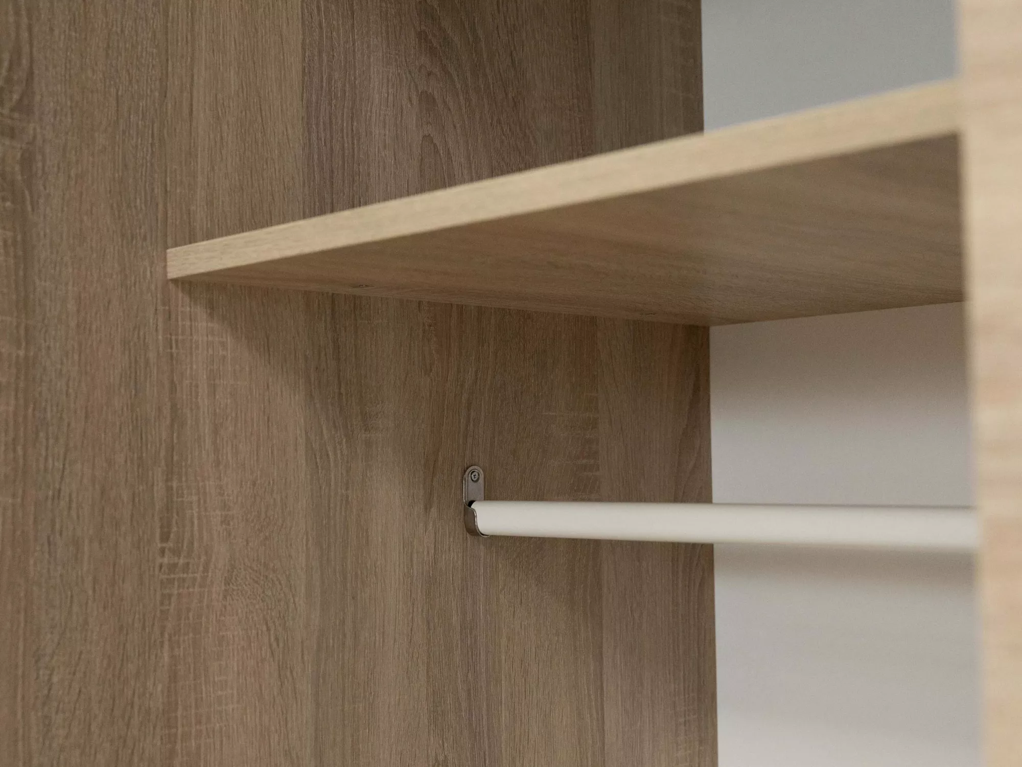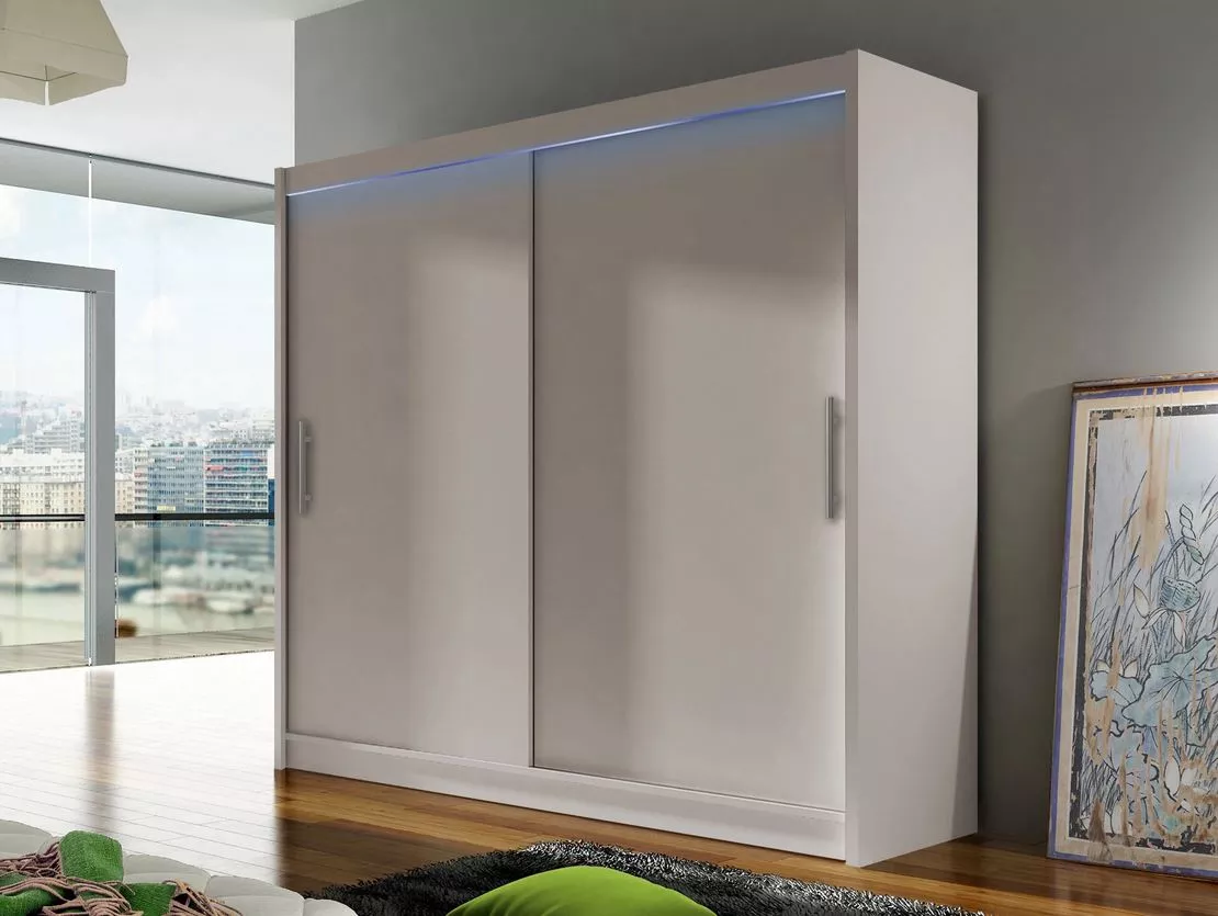 Kombinovaná šatní skříň s posuvnými dveřmi se hodí do každého moderního interiéru. Vnitřní uspořádání je tvořeno hlubokými policemi a šatní tyčí, které umožňují snadné oddělení každodenních věcí. Skříň je vybavena praktickým barevným RGB LED osvětlením, které vám usnadní hledání vašeho perfektního kousku oblečení.