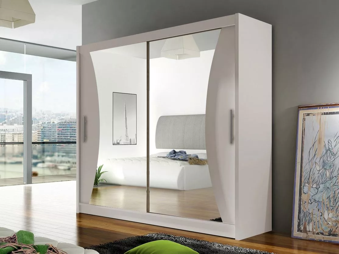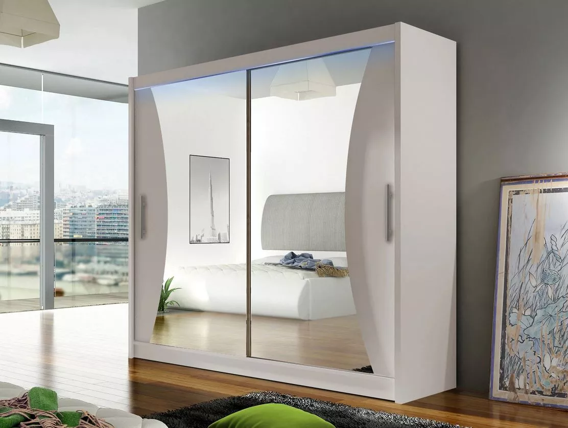 Šatní skříň se zrcadlem a LED osvětlením FLORENCIO 5 se hodí do každého moderního interiéru. Vnitřní uspořádání je tvořeno hlubokými policemi a šatní tyčí, které umožňují snadné oddělení každodenních věcí. Systém posuvných dveří zaručuje snadné a jednoduché ovládání dveří. Skříň je vybavena inovativním RGB LED osvětlením, které nabízí výběr mezi 15 barevnými variantami. LED osvětlení se ovládá pomocí přiloženého dálkového ovládání.