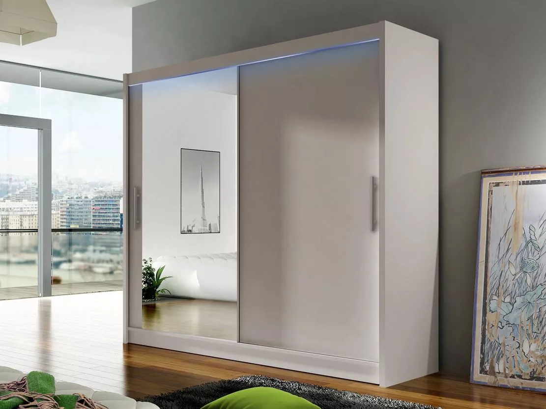 Šatní skříň se zrcadlem a LED osvětlením FLORENCIO 6 se hodí do každého moderního interiéru. Vnitřní uspořádání je tvořeno hlubokými policemi a šatní tyčí, které umožňují snadné oddělení každodenních věcí. Systém posuvných dveří zaručuje snadné a jednoduché ovládání dveří. Skříň je vybavena inovativním RGB LED osvětlením, které nabízí výběr mezi 15 barevnými variantami. LED osvětlení se ovládá pomocí přiloženého dálkového ovládání.