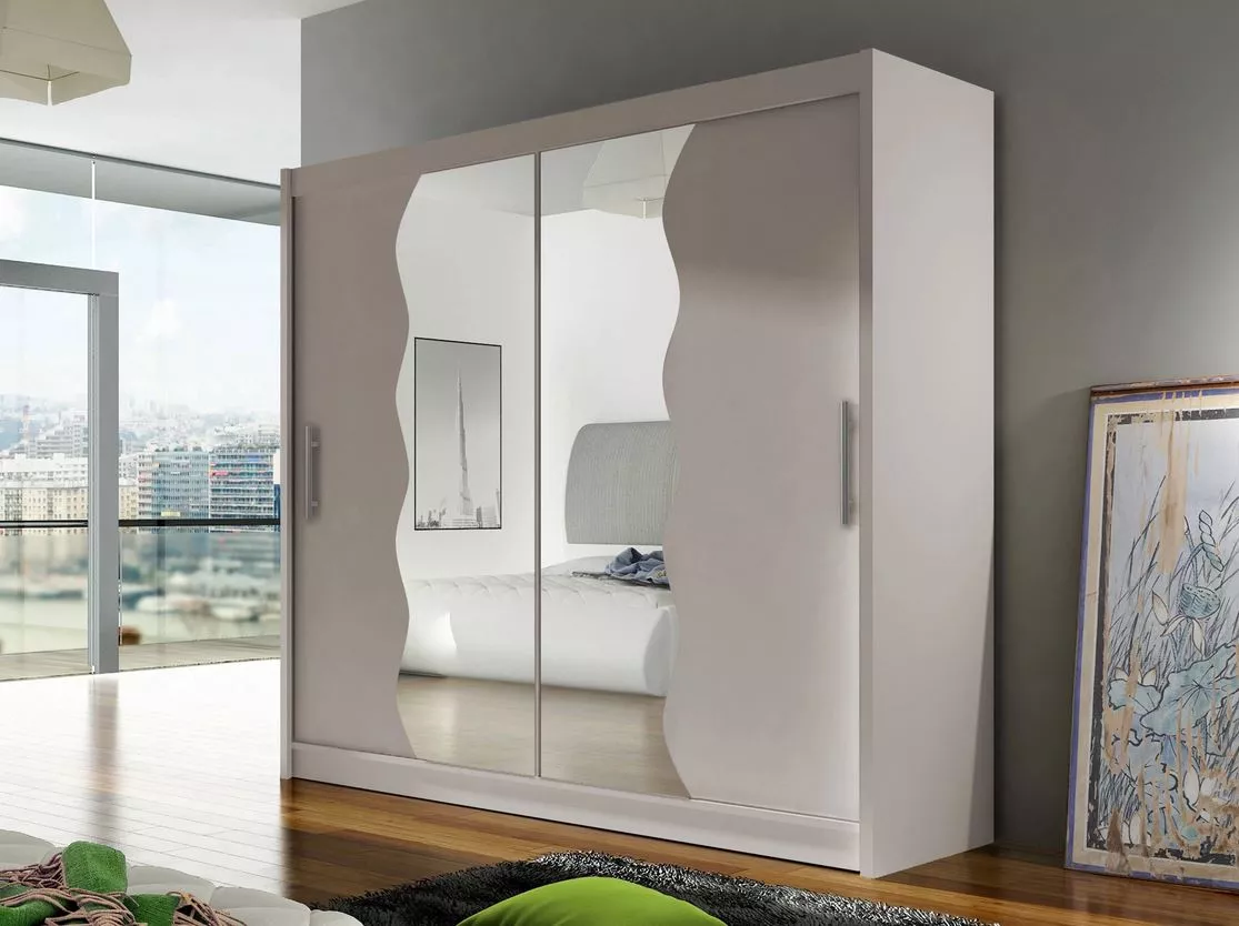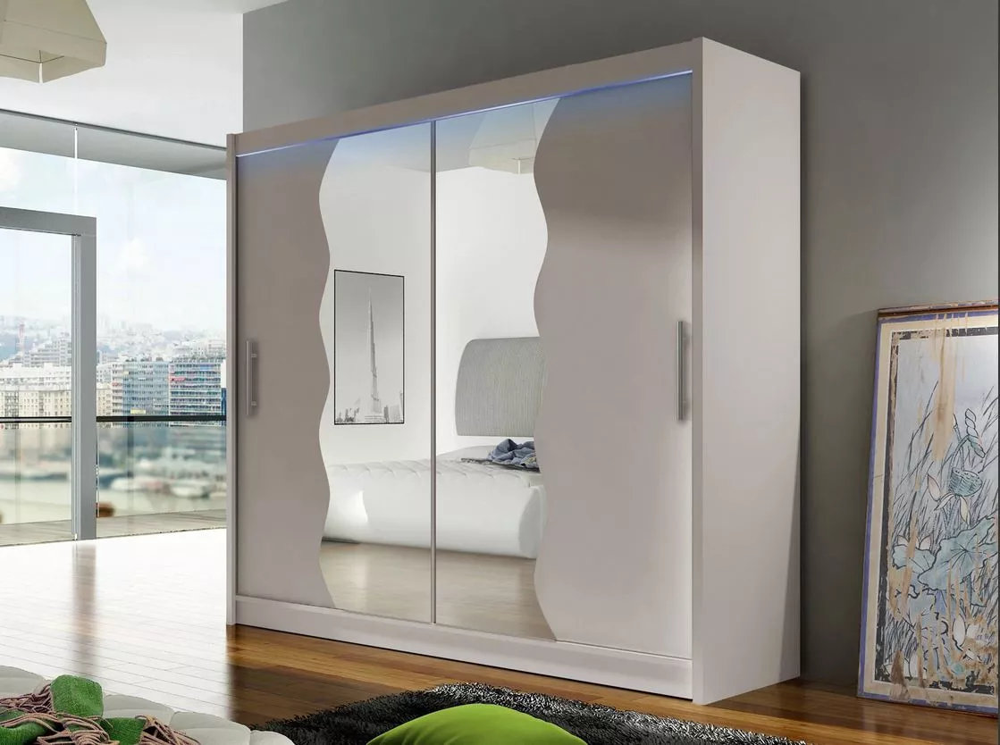 Šatní skříň se zrcadlem a LED osvětlením FLORENCIO 10 se hodí do každého moderního interiéru. Vnitřní uspořádání je tvořeno hlubokými policemi a šatní tyčí, které umožňují snadné oddělení každodenních věcí. Systém posuvných dveří zaručuje snadné a jednoduché ovládání dveří. Skříň je vyrobena z kvalitní LTD desky, jejíž hrany byly zesíleny ABS dýhou, což zaručuje vysokou kvalitu. Zrcadlo, které je umístěno uprostřed, dodává šatníku kouzlo, zatímco zvětšuje a osvětluje místnost, ve které bude skříň umístěna. Skříň je vybavena inovativním RGB LED osvětlením, které nabízí výběr mezi 15 barevnými variantami. LED osvětlení se ovládá pomocí přiloženého dálkového ovládání.