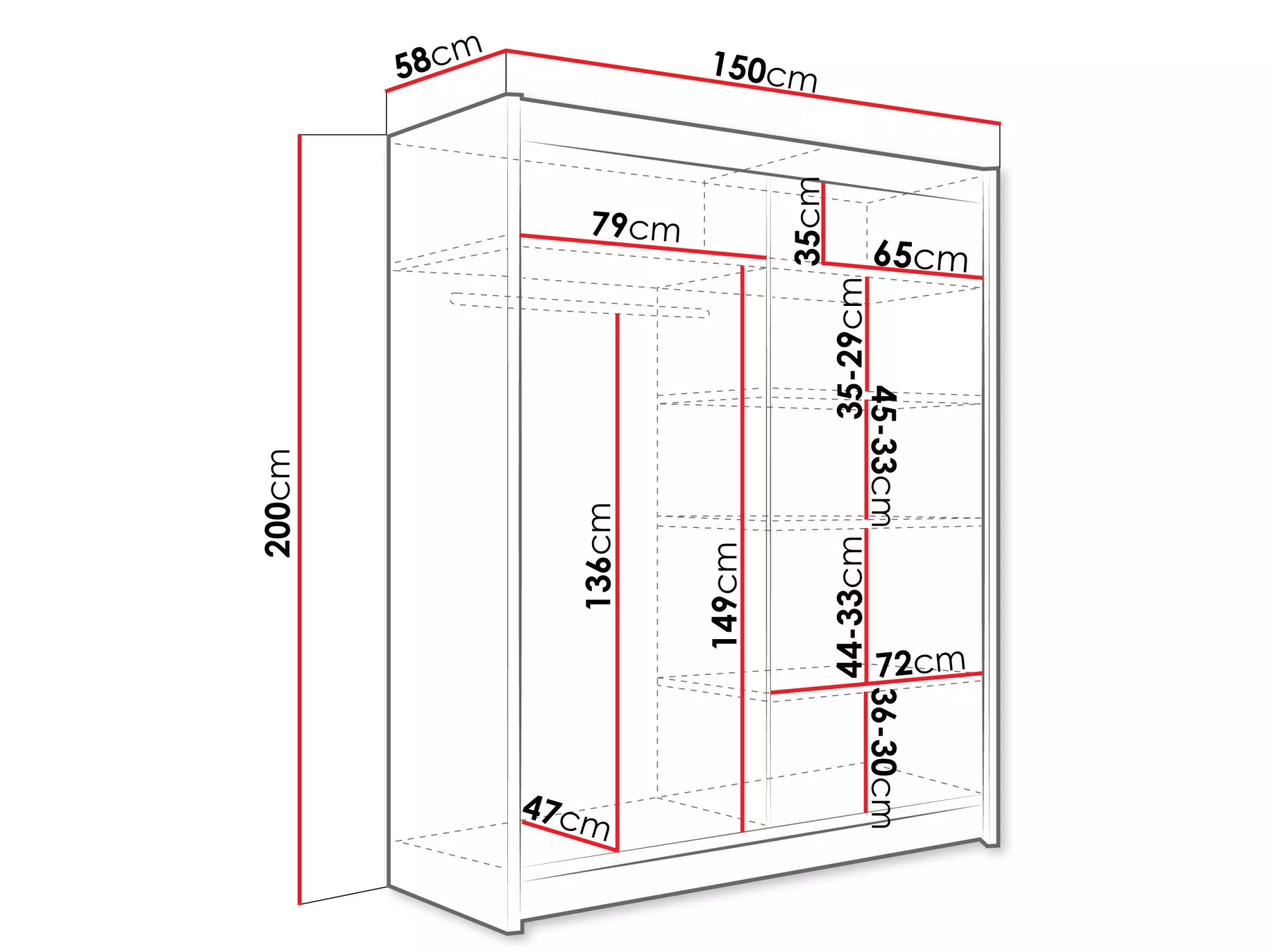 Šatní skříň s posuvnými dveřmi PIRITU 1 je vyrobena z kvalitních komponentů, které zaručují její stabilitu a odolnost. Vnitřek skříně je rozdělen do praktických zón, které napomáhají uspořádání. Součástí skříně je praktické zrcadlo.