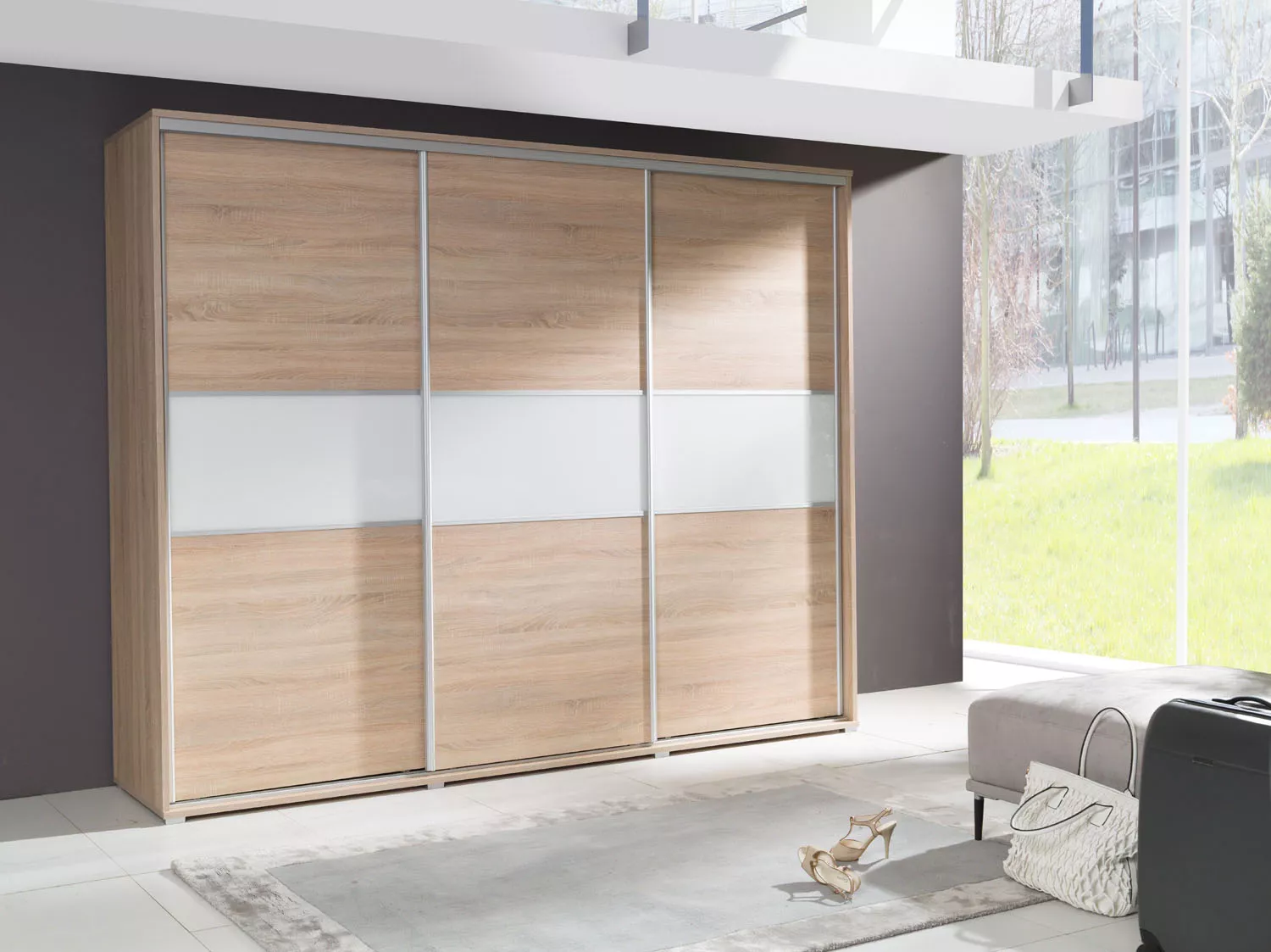 Šatní skříň ZUMBRO je ideální volbou pro ty, kteří hledají prostorné a stylové řešení do své ložnice. Vnitřek skříně nabízí mnoho polic a šatní tyč, které poskytují dostatek místa pro oblečení. Prostorné zásuvky jsou ideální pro uložení drobností. Díky své šířce skříň 277 cm pojme velké množství věcí, což ji činí ideální pro majitele rozsáhlé sbírky oblečení. Skleněné vložky na posuvných dveřích přidávají skříni moderní vzhled a zdůrazňují jedinečný styl skříně.