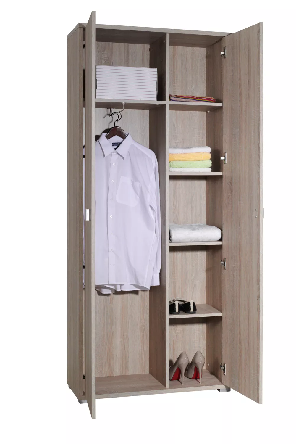 Dvoudveřová šatní skříň KINNEY je praktickým řešením pro uložení oblečení, obuvi a doplňků. Je vybavena šatní tyčí, která vám umožní pohodlně pověsit vaše oblečení, což zajišťuje snadný přístup a organizaci. Další police umožňují třídit a ukládat menší předměty, jako je spodní prádlo nebo doplňky. Pevná konstrukce zajišťuje odolnost a stabilitu šatní skříně a zaručuje její dlouhodobé používání.