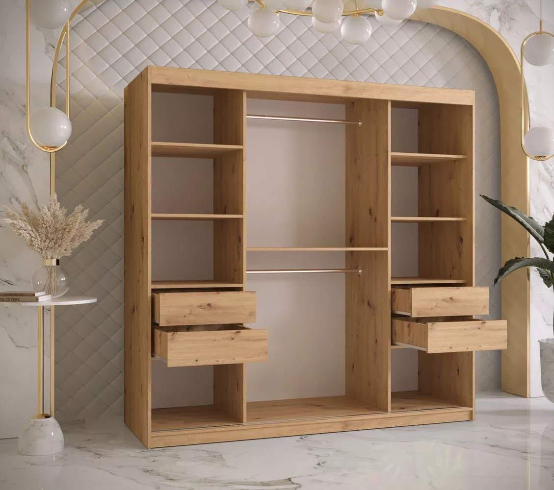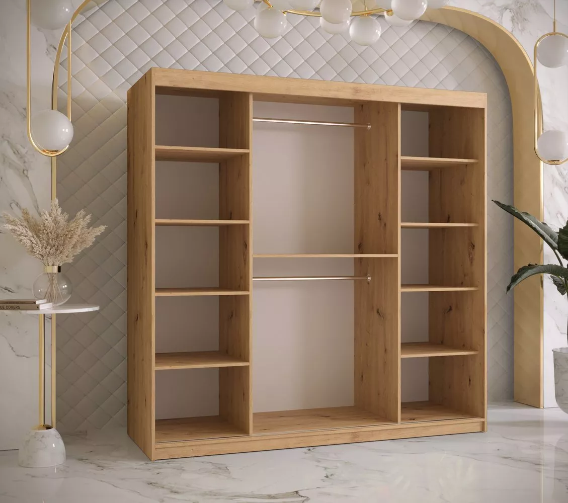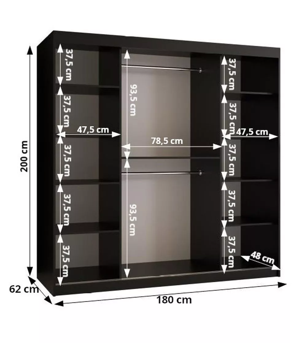 Prostorná šatní skříň bude svým netradičním vzhledem zajímavým prvkem v místnosti a díky posuvným dveřím vyřeší případný dostatek místa. Vnitřní uspořádání skříně nabízí dostatek polic k uskladnění osobních věcí a šatní tyč k zavěšení ramínek.