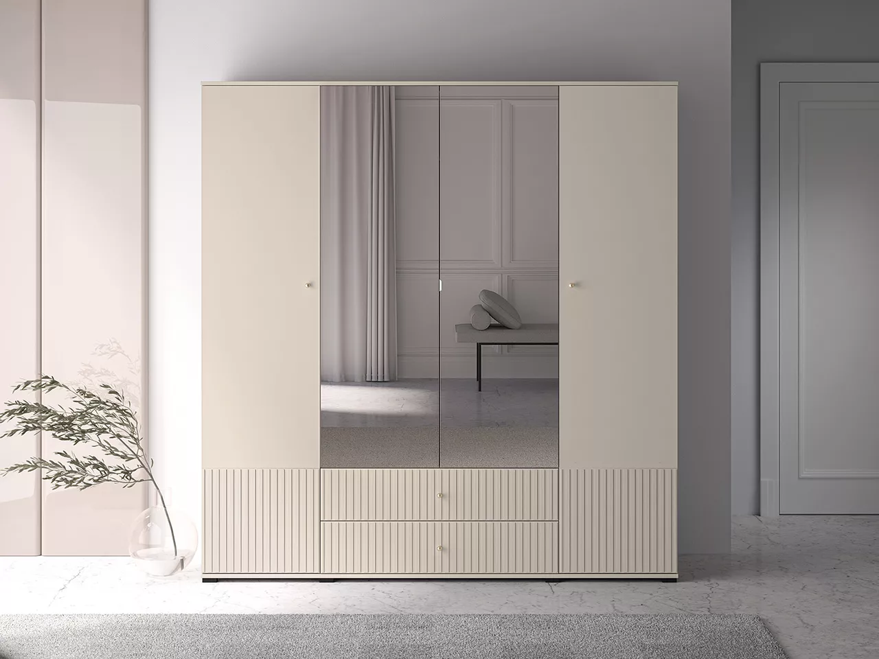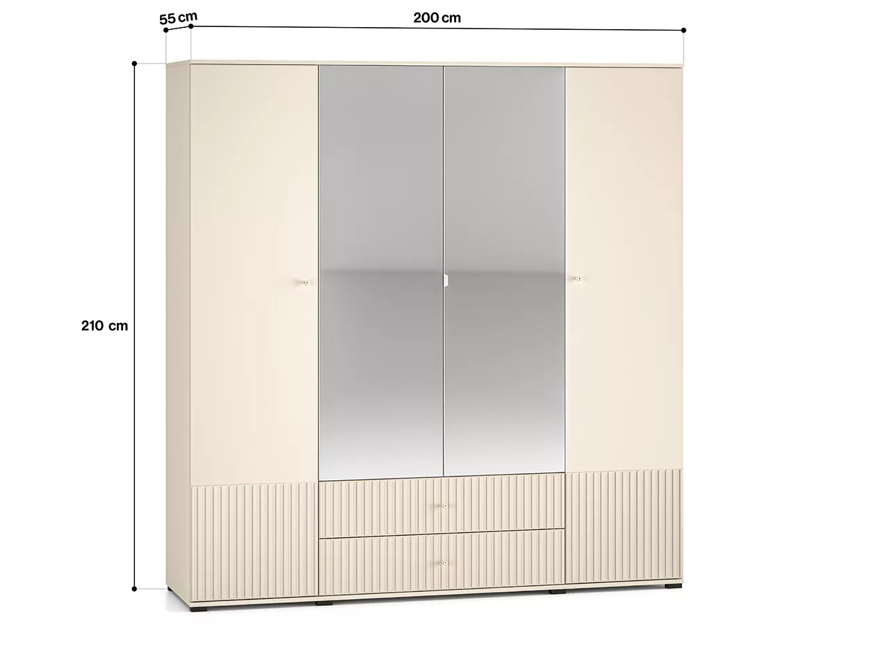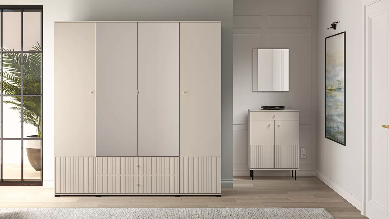 Velká šatní skříň 200 FAREL zaujme svými zčásti drážkovanými dvířky a šuplíky se zlatými úchytkami. Skříň je vybavena šatní tyčí pro zavěšení oblečení, 2 šuplíky, prostornými policemi a zrcadlem.