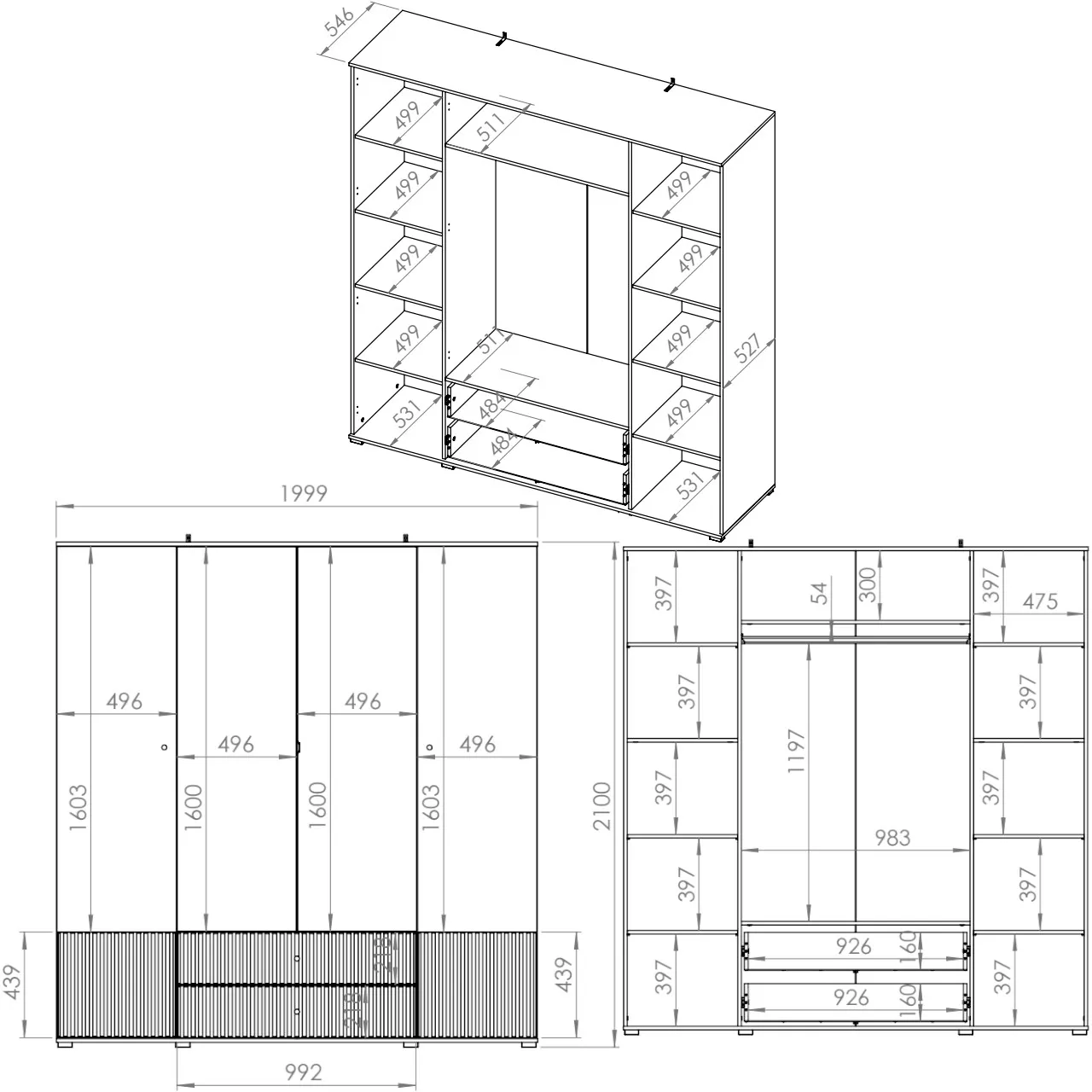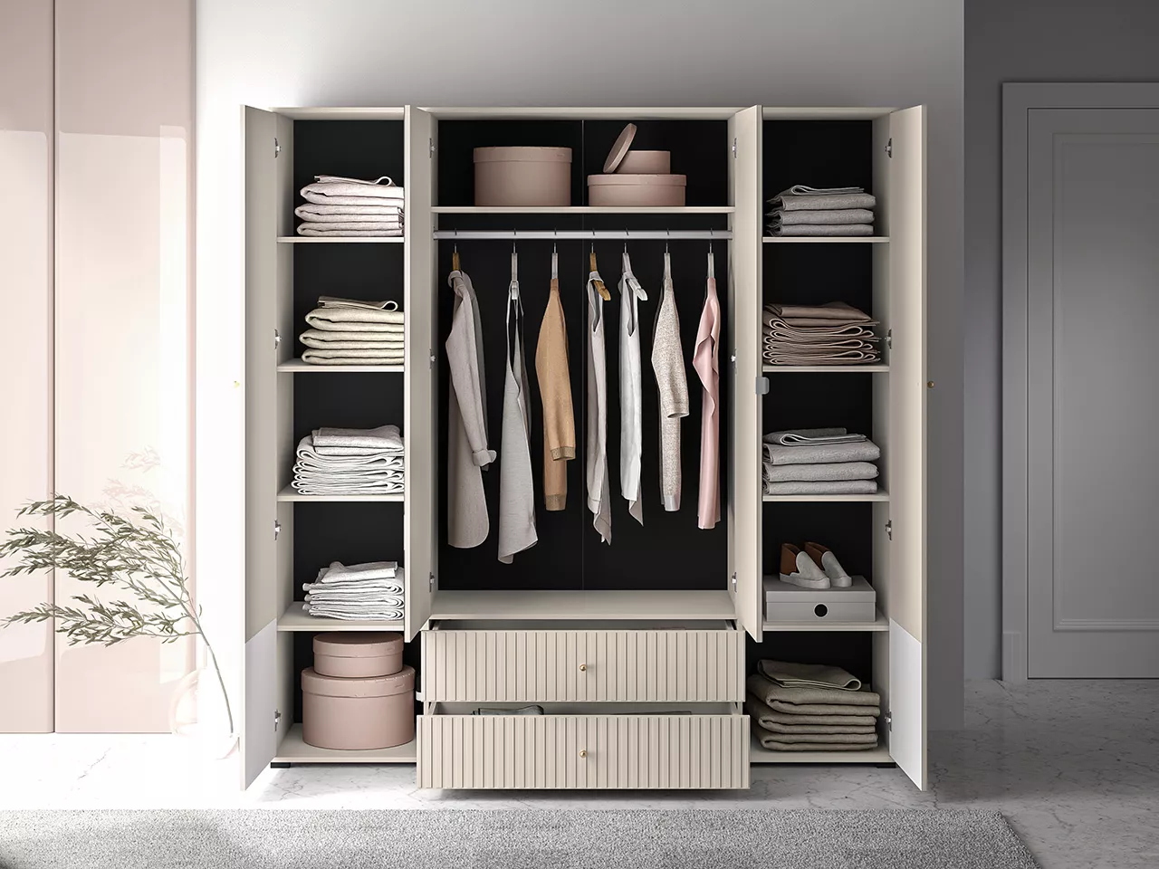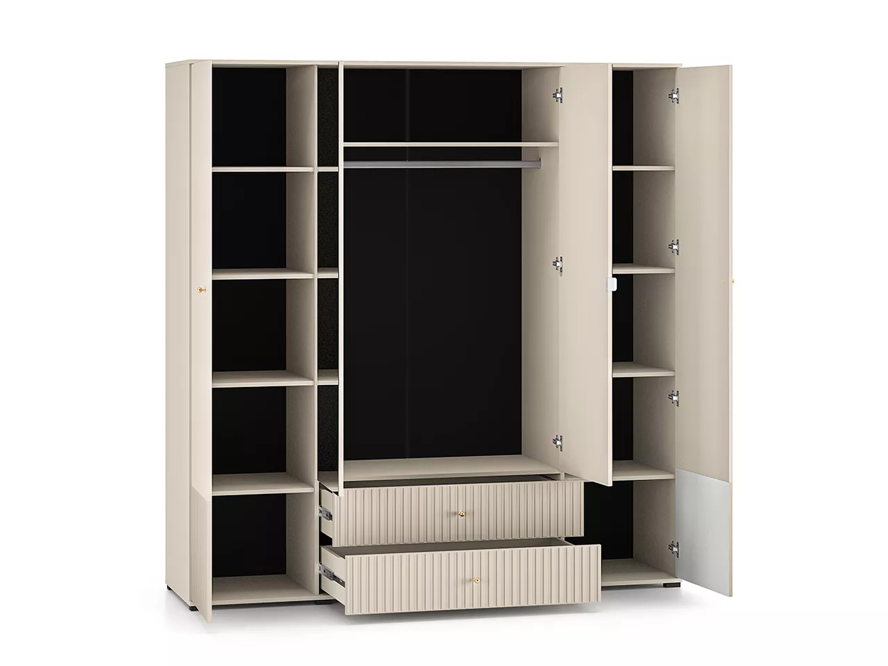 Velká šatní skříň 200 FAREL zaujme svými zčásti drážkovanými dvířky a šuplíky se zlatými úchytkami. Skříň je vybavena šatní tyčí pro zavěšení oblečení, 2 šuplíky, prostornými policemi a zrcadlem.