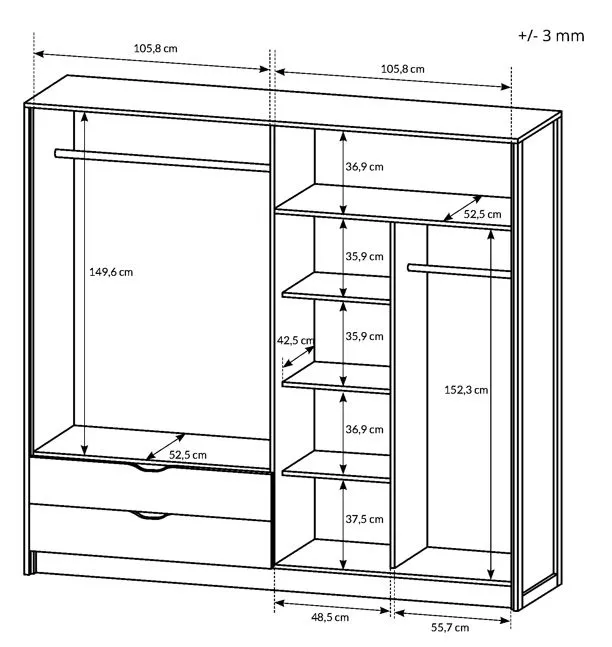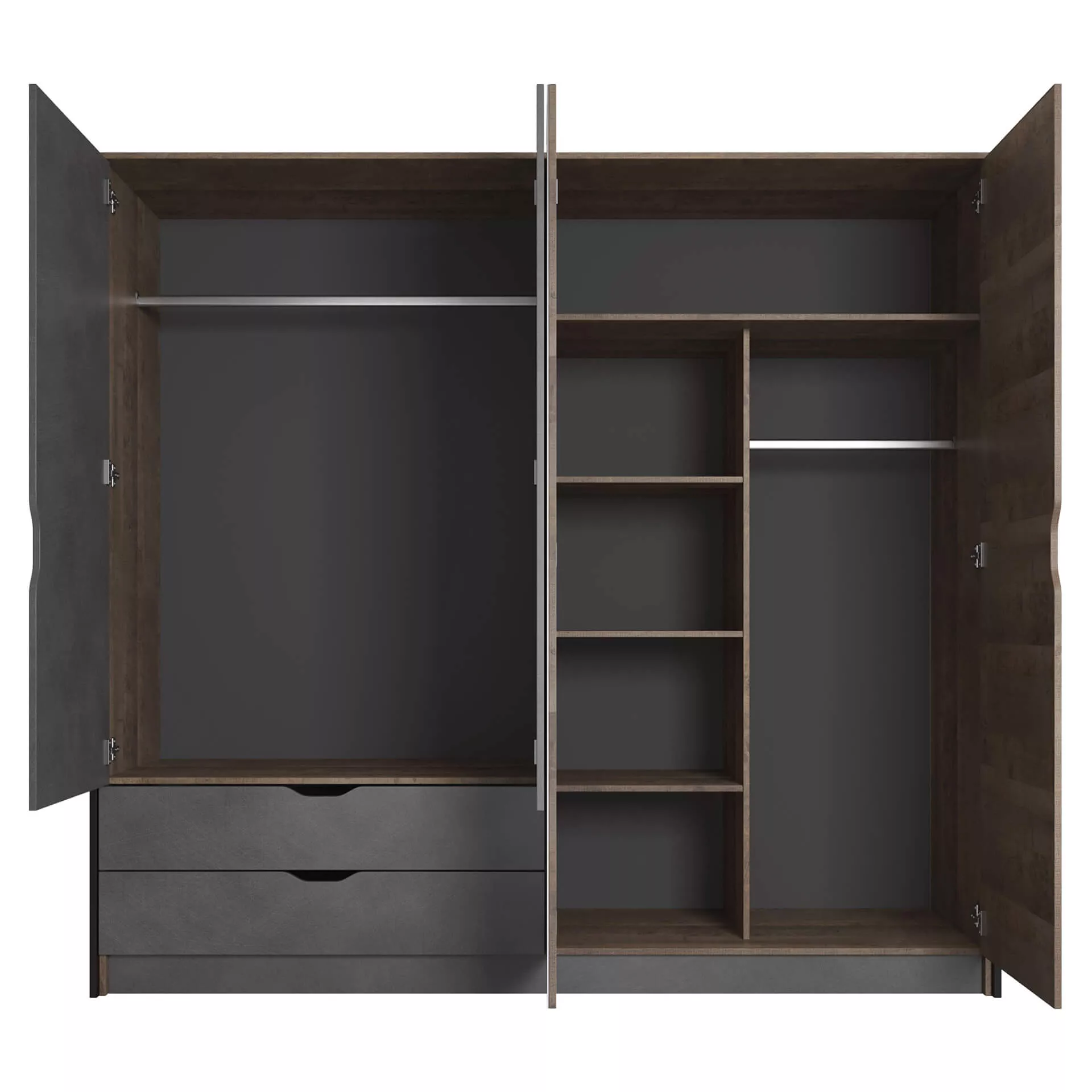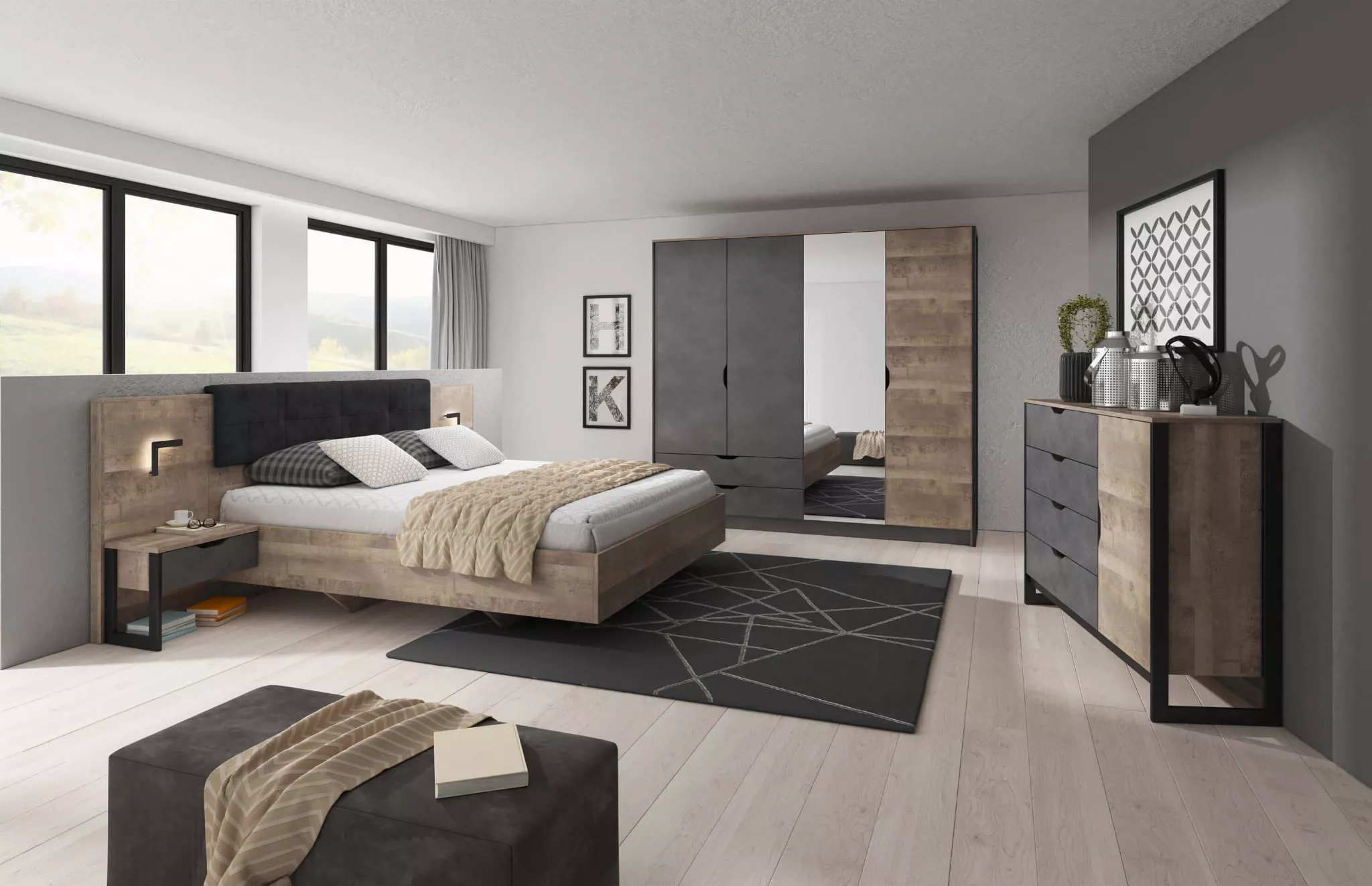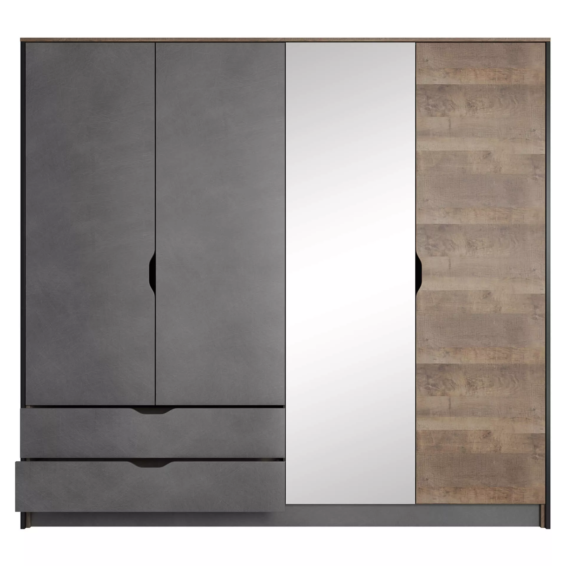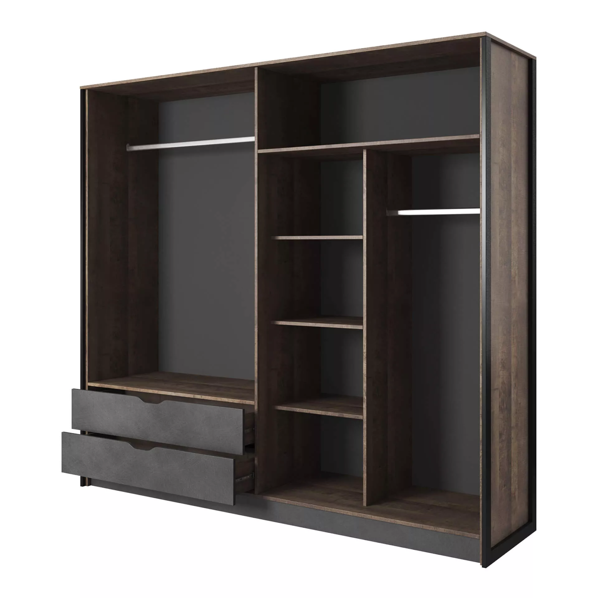 Šatní skříň GORDO osloví originálním industriálním vzhledem, který spojuje přírodní dekor dubu sand grande s tmavým akcentem v barvě matera. Zrcadlo na dvířkách opticky zvětší prostor, zatímco šuplíky, police a šatní tyč zajistí přehledné a praktické uspořádání vašich věcí. Charakteristické boční rámy podtrhují robustní loftový vzhled.