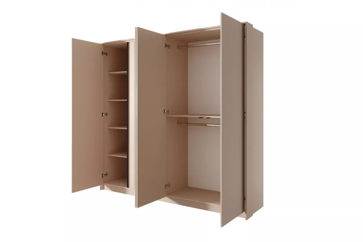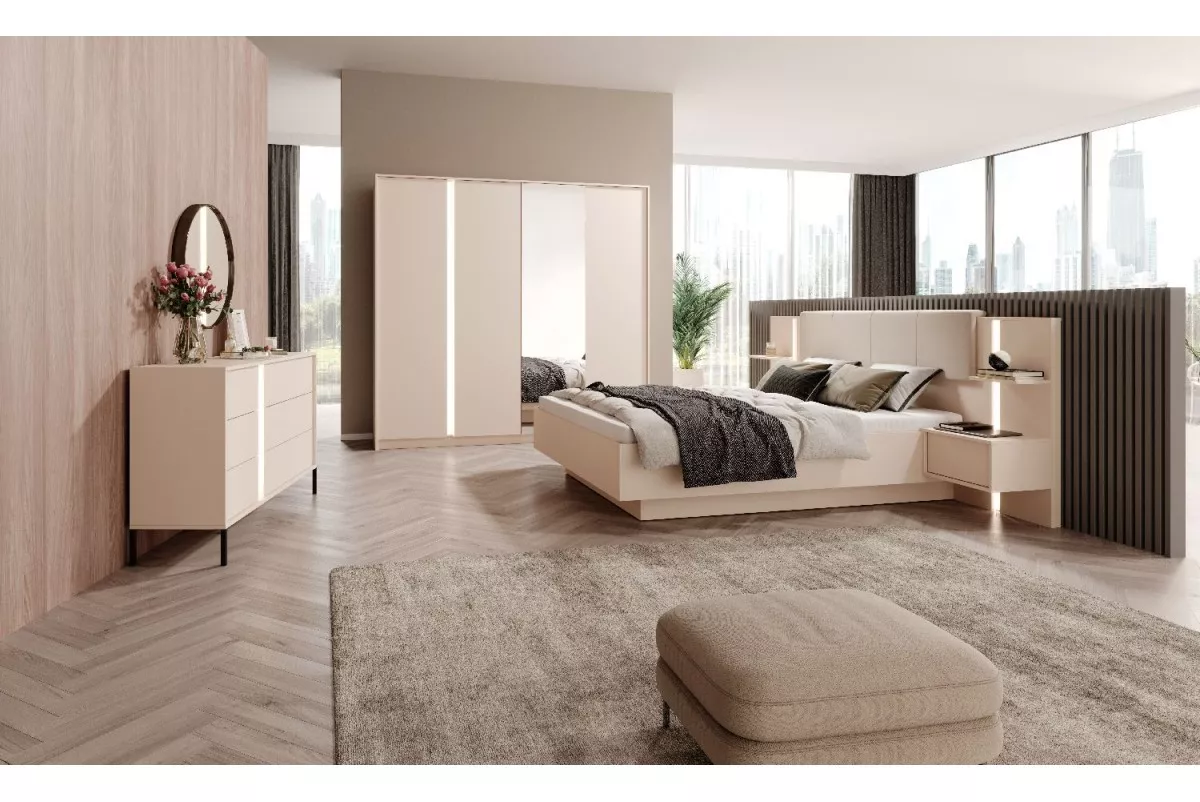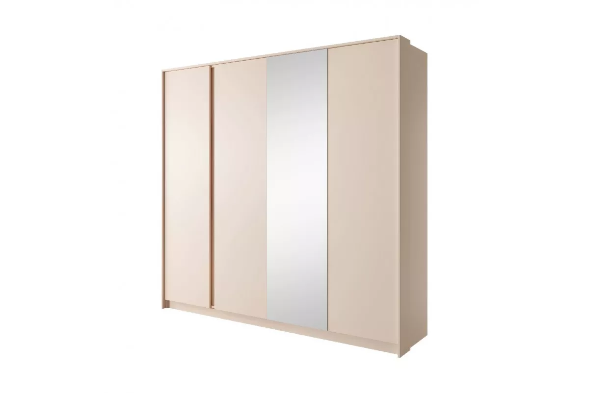 Velká zrcadlová šatní skříň SLOCOMB o šířce 220 cm zaujme elegantními, čistými liniemi a moderním odstínem béžové, který vnáší do interiéru klid a styl. Uvnitř nabízí 2 řady hlubokých polic a 2 šatní tyče pro maximální přehled a úložný komfort. Možnost doplnění o LED osvětlení podtrhne sofistikovaný vzhled skříně.