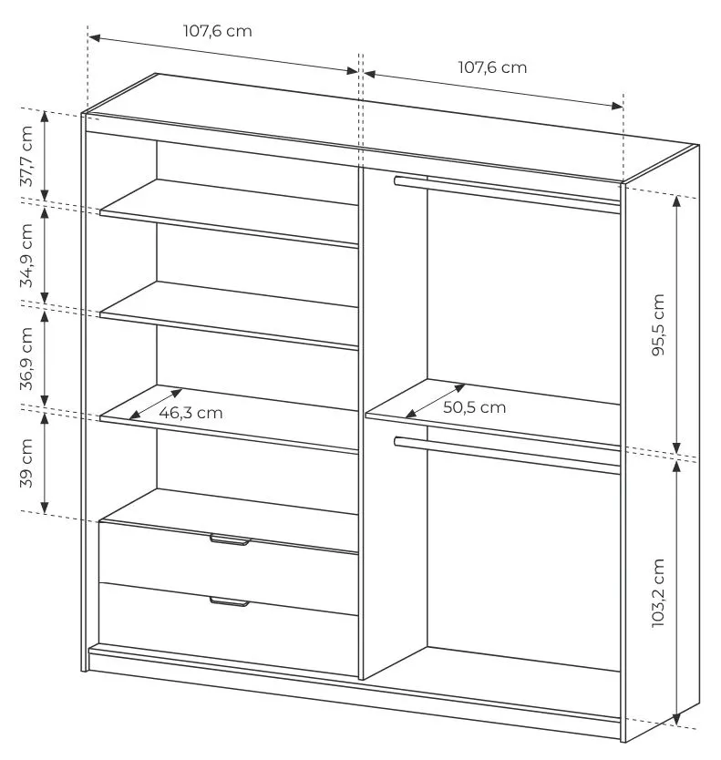 Šatní skříň se zrcadlem REFORM o šířce 220 cm spojuje dokonalé zemitě tlumené tóny – dub artisan a antracitovou barvu, které vaší ložnici dodají útulný a přírodní nádech. Lamely na dvířkách skříně dodávají moderní šmrnc a podtrhují čisté linie designu. Uvnitř skříň nabízí dvě šatní tyče, police a šuplíky pro přehledné a praktické uspořádání věcí.