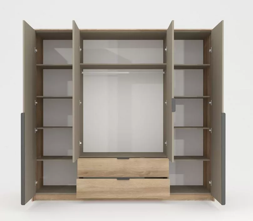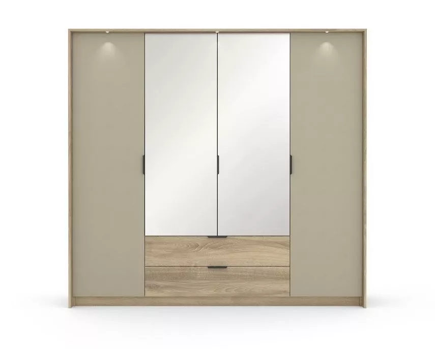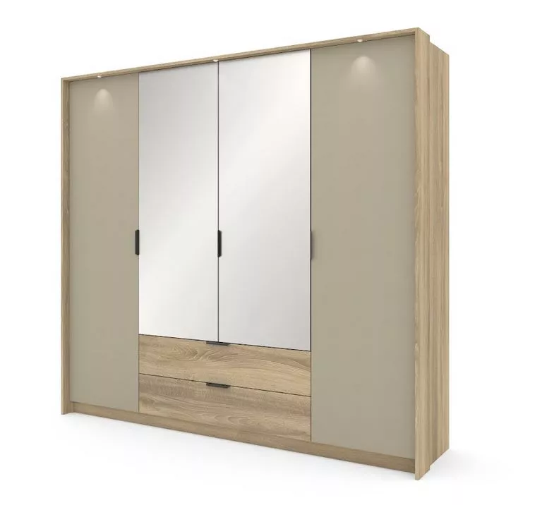Objevte velkou šatní skříň PRATTVILE, která nabízí promyšlené úložné řešení a stylový vzhled. Zrcadlové dveře opticky zvětší prostor, zatímco hluboké police, šatní tyč a praktické šuplíky pojmou oblečení i doplňky. Kombinace dekoru dub terra a kamenné šedi v jednoduchém skandinávském designu působí elegantně a nadčasově – s možností dokoupení LED osvětlení navíc získáte útulnou atmosféru i praktičnost.
