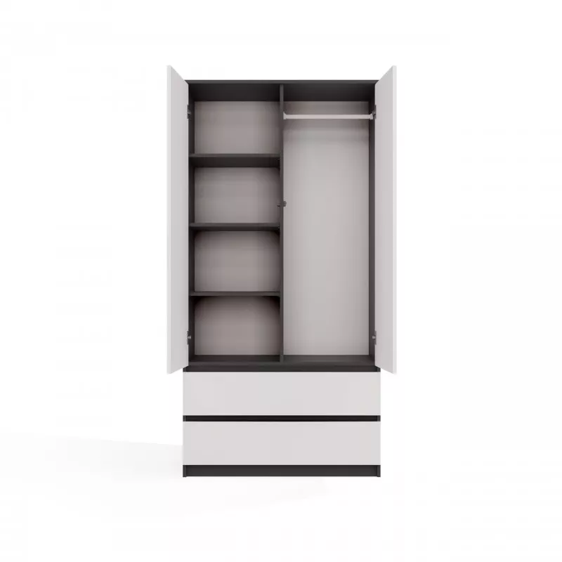 Šatní skříň do předsíně TAAVI umožňuje pečlivě organizovat prostor v místnosti. Uvnitř skříně naleznete tyč na ramínka a prostorné police, ve spodní části pak 2 praktické šuplíky.
