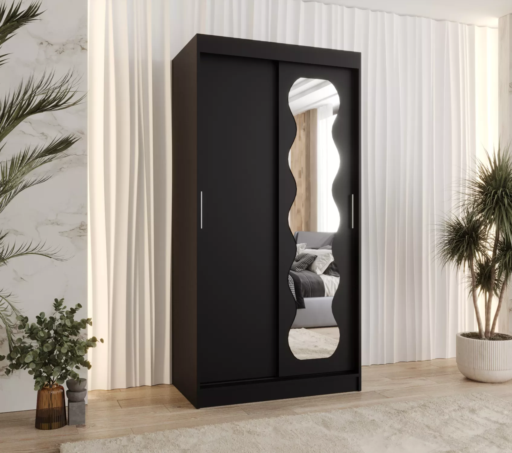 Šatní skříň 100 cm ROZANA díky svému vnitřnímu uspořádání nabízí dostatek úložného prostoru. Posuvné dveře se zrcadlem usnadňují manipulaci a šetří prostor v interiéru.
