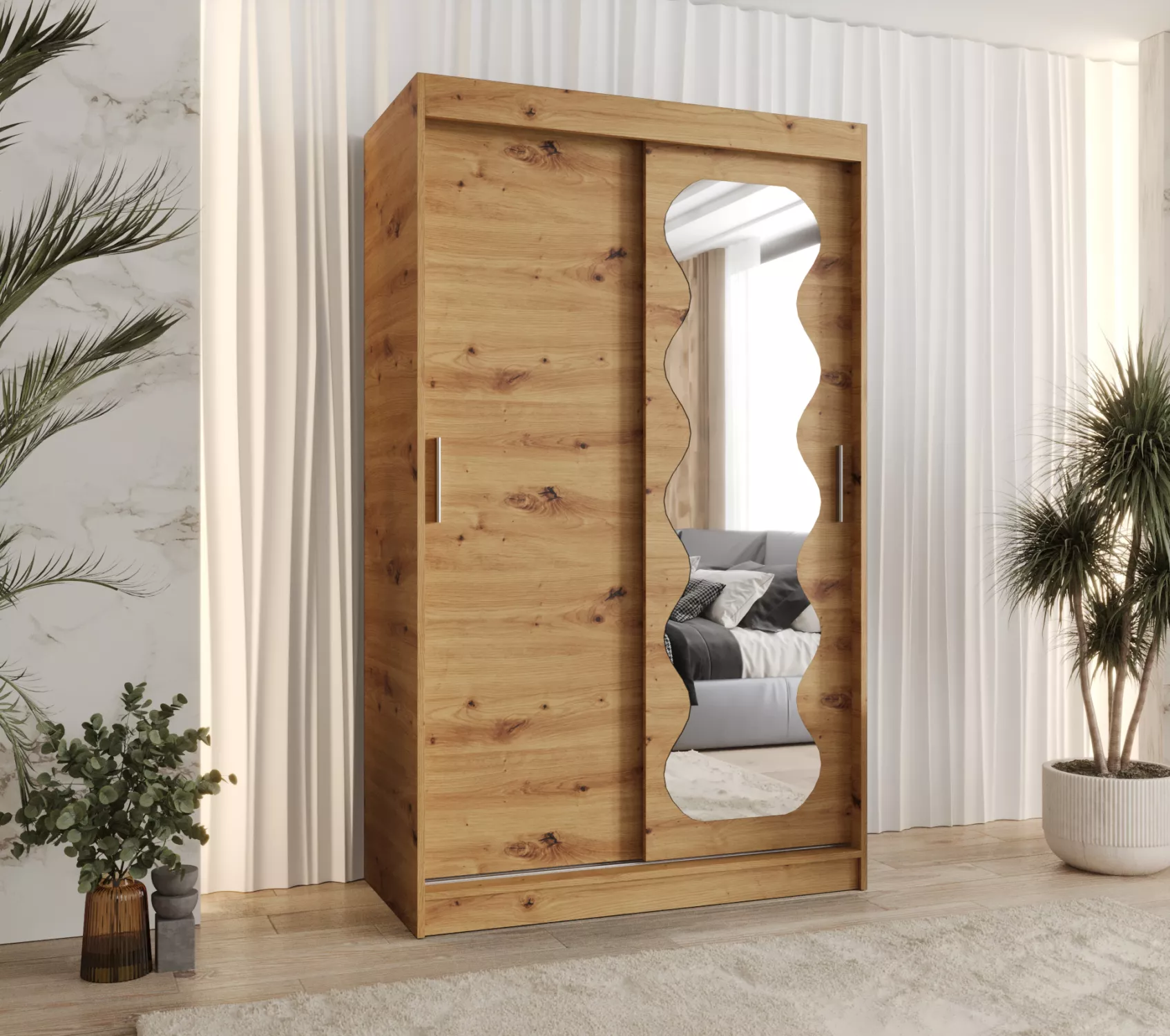 Šatní skříň 120 cm ROZANA díky svému vnitřnímu uspořádání nabízí dostatek úložného prostoru. Posuvné dveře se zrcadlem usnadňují manipulaci a šetří prostor v interiéru.