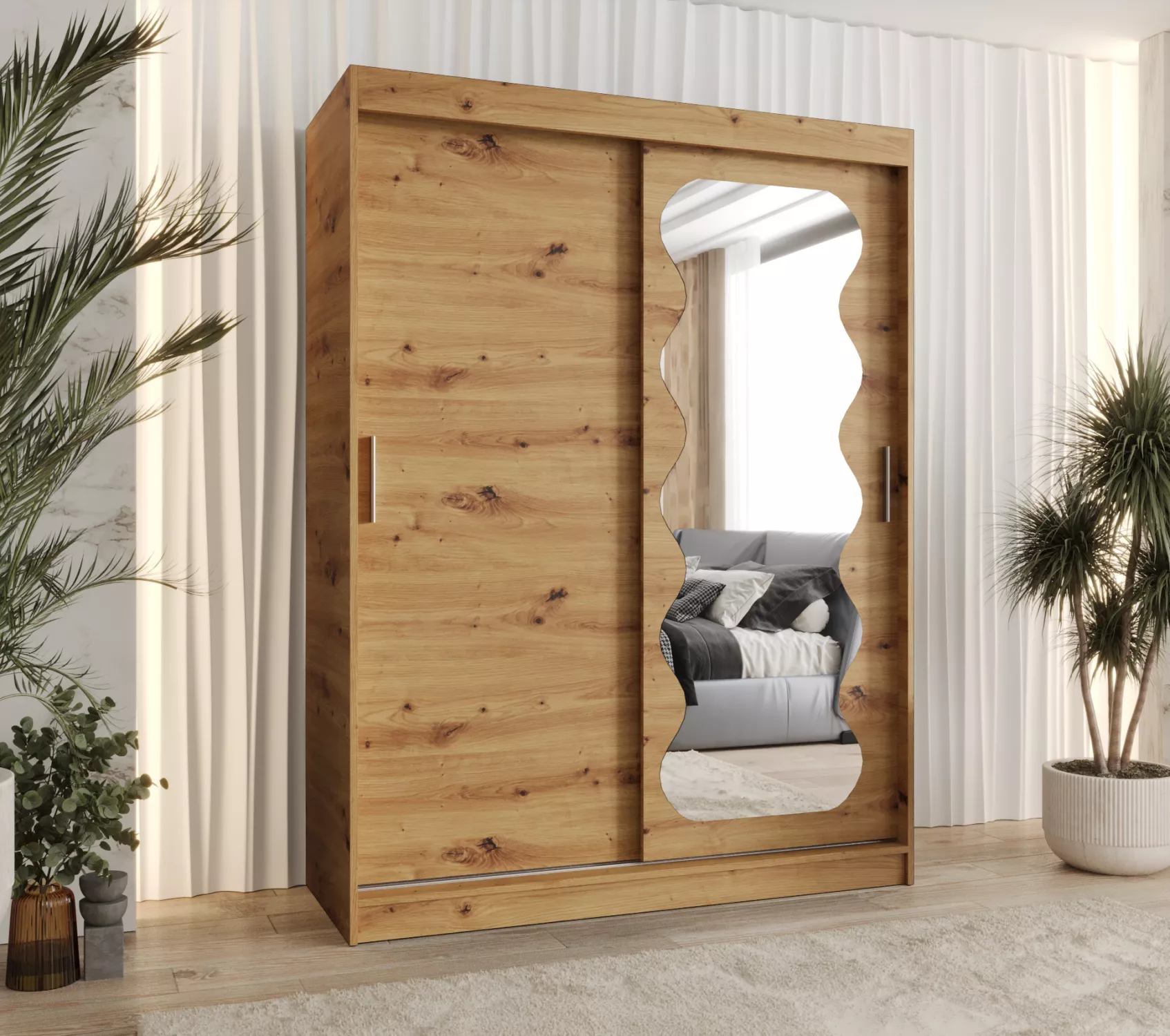Šatní skříň 150 cm ROZANA díky svému vnitřnímu uspořádání nabízí dostatek úložného prostoru. Posuvné dveře se zrcadlem usnadňují manipulaci a šetří prostor v interiéru.