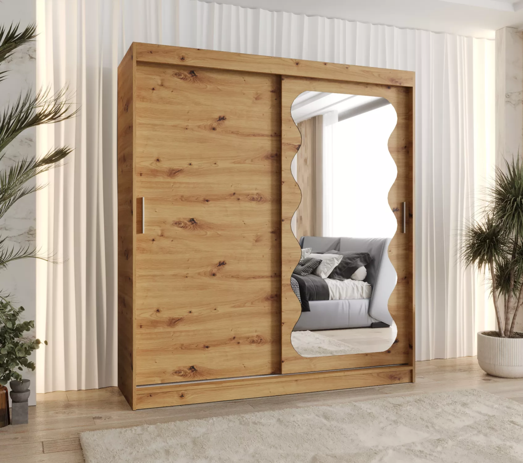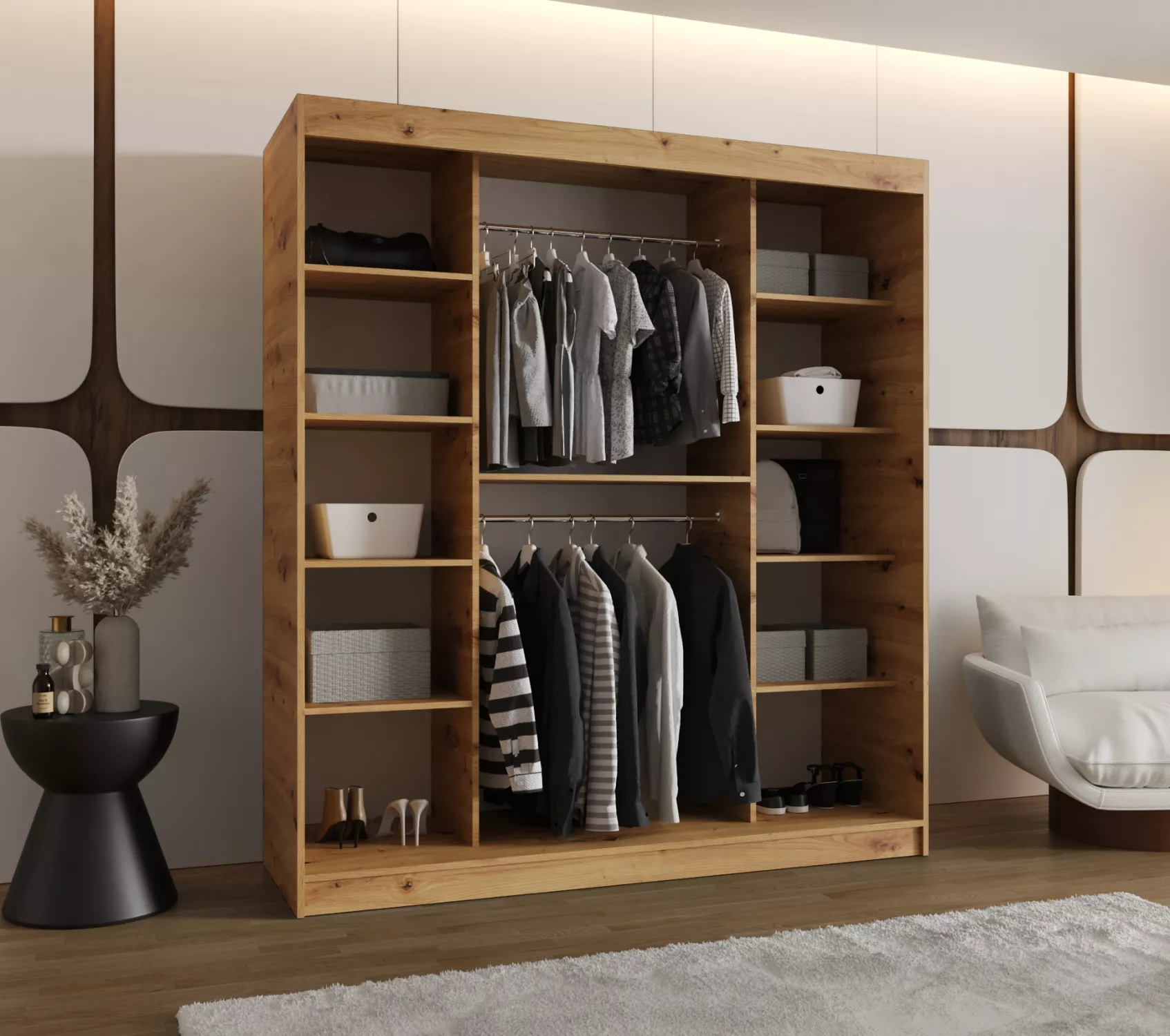 Šatní skříň 180 cm ROZANA díky svému vnitřnímu uspořádání nabízí dostatek úložného prostoru. Posuvné dveře se zrcadlem usnadňují manipulaci a šetří prostor v interiéru.