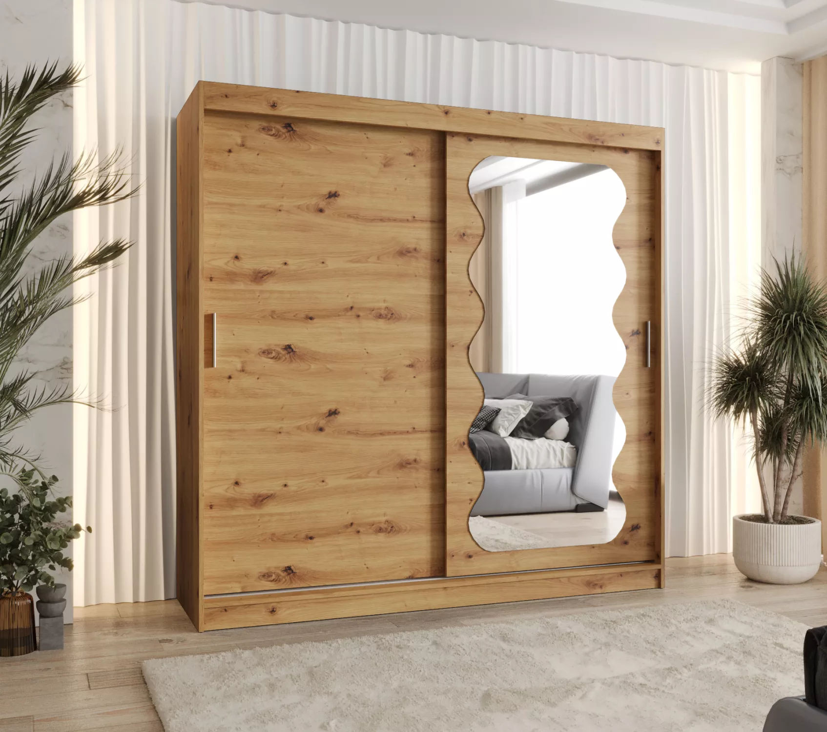 Šatní skříň 200 cm ROZANA díky svému vnitřnímu uspořádání nabízí dostatek úložného prostoru. Posuvné dveře se zrcadlem usnadňují manipulaci a šetří prostor v interiéru.