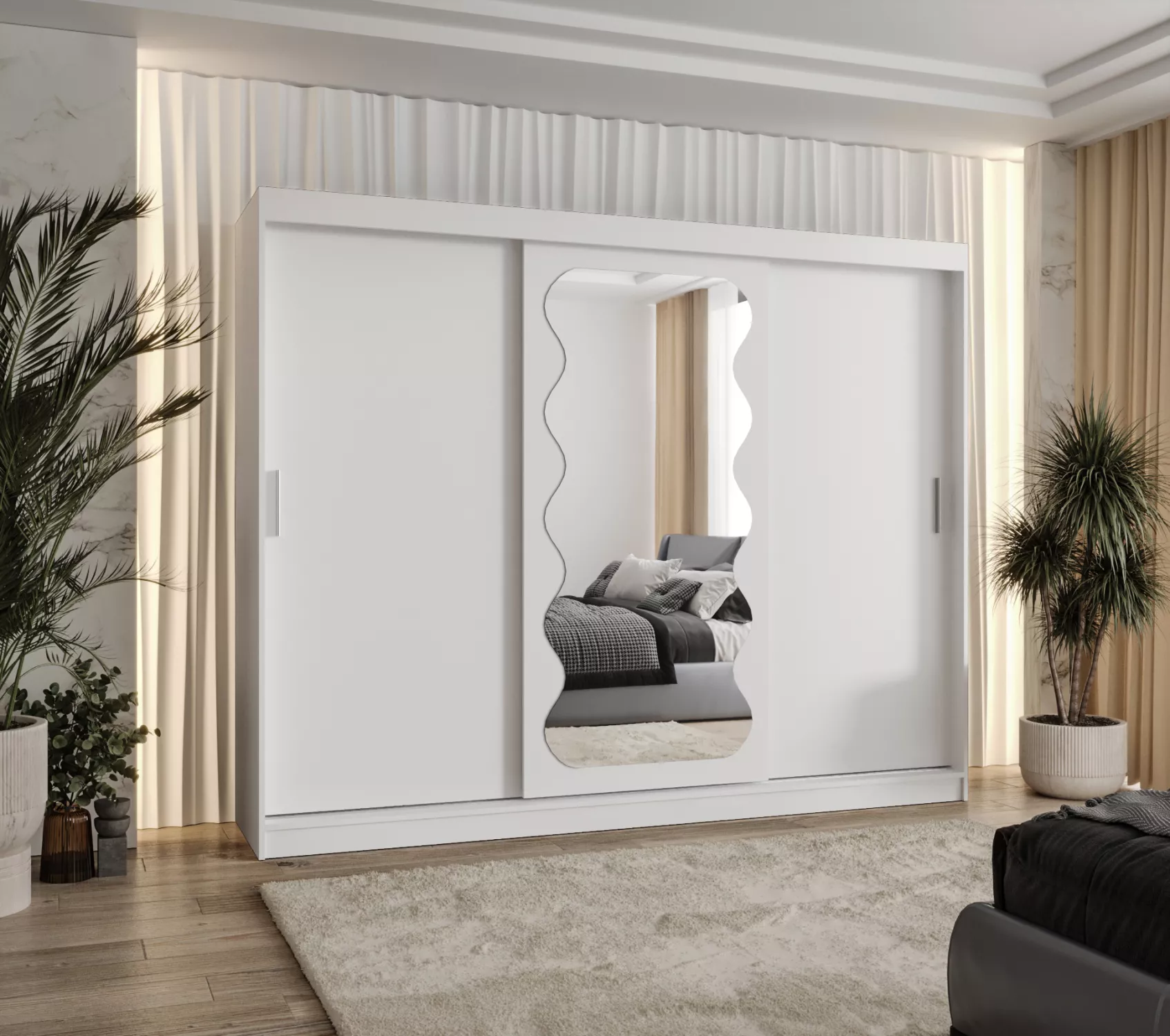 Šatní skříň 250 cm ROZANA díky svému vnitřnímu uspořádání nabízí dostatek úložného prostoru. Posuvné dveře se zrcadlem usnadňují manipulaci a šetří prostor v interiéru.