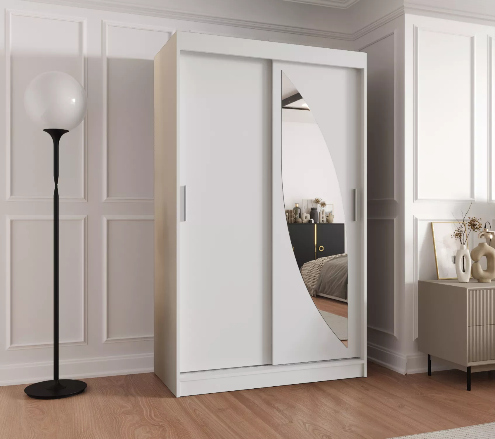 Šatní skříň 120 cm SUDENA s posuvnými dveřmi díky svému vnitřnímu uspořádání nabízí dostatek úložného prostoru. Zrcadlo opticky zvětší prostor.