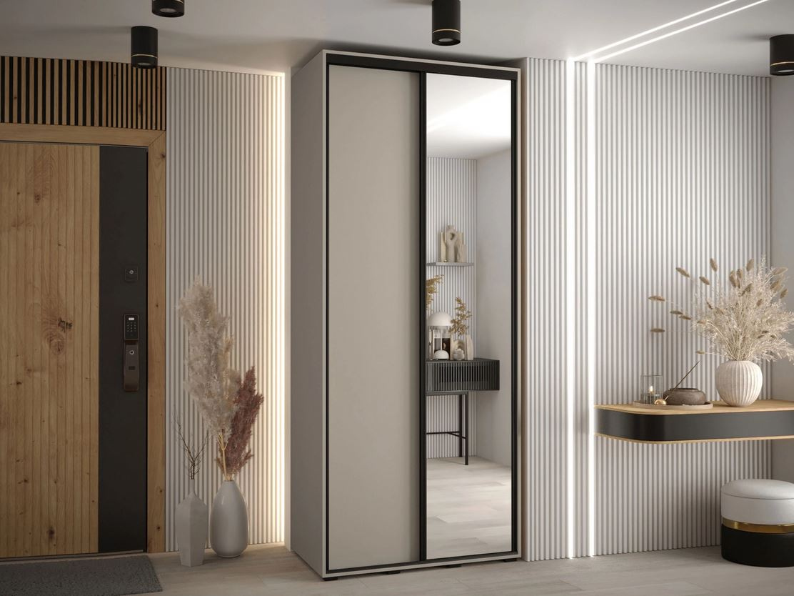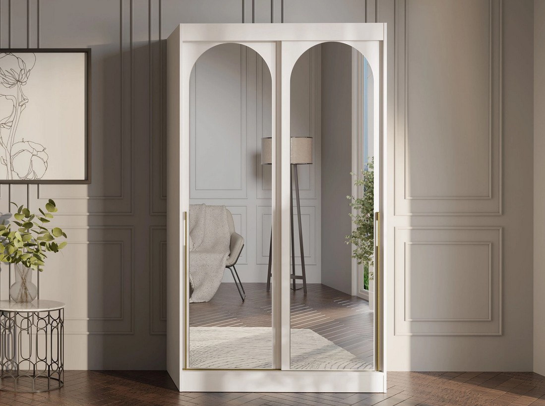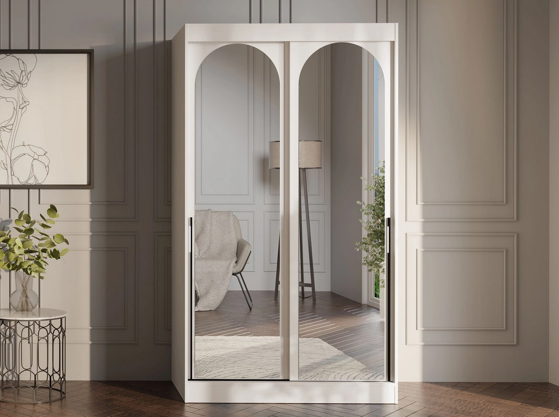 Šatní skříň 120 cm SUDENA s posuvnými dveřmi díky svému vnitřnímu uspořádání nabízí dostatek úložného prostoru. Zrcadlo opticky zvětší prostor.